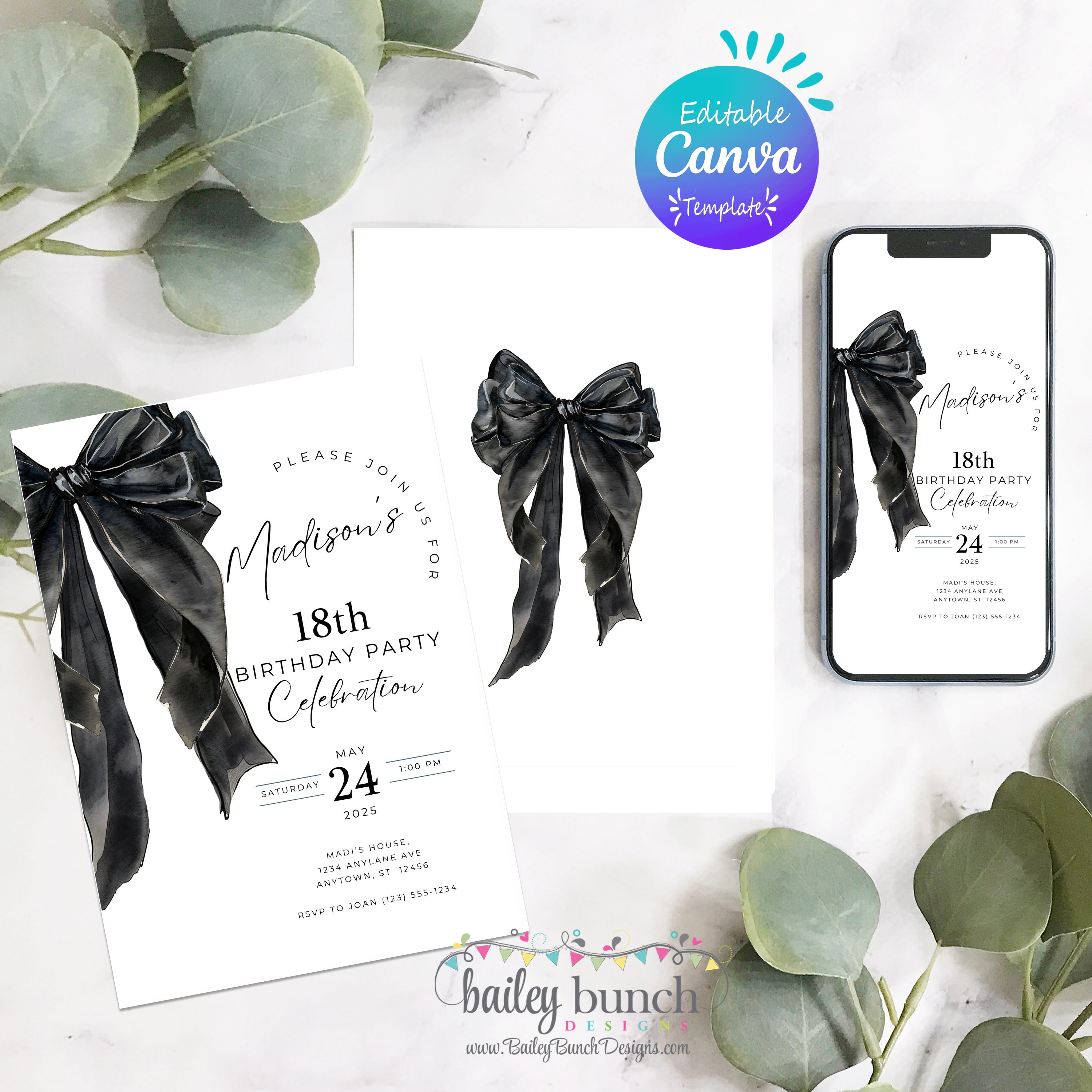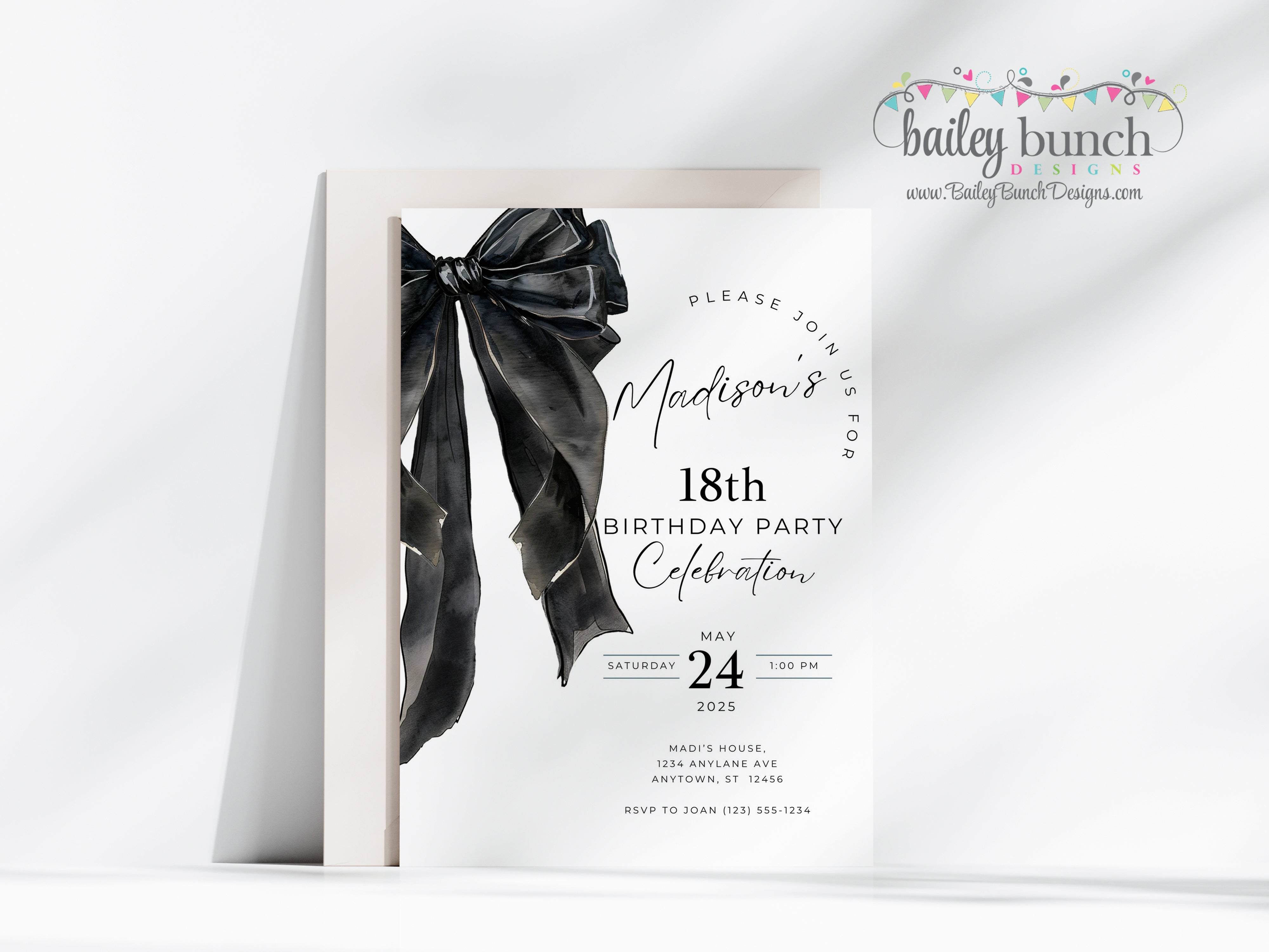 πŸŽ€ Personalized Black Bow Birthday Invitation πŸŽ€ ANY AGE! Editable Template | 5x7" JPG, PDF, Double Sided, Back Design & phone invite included!