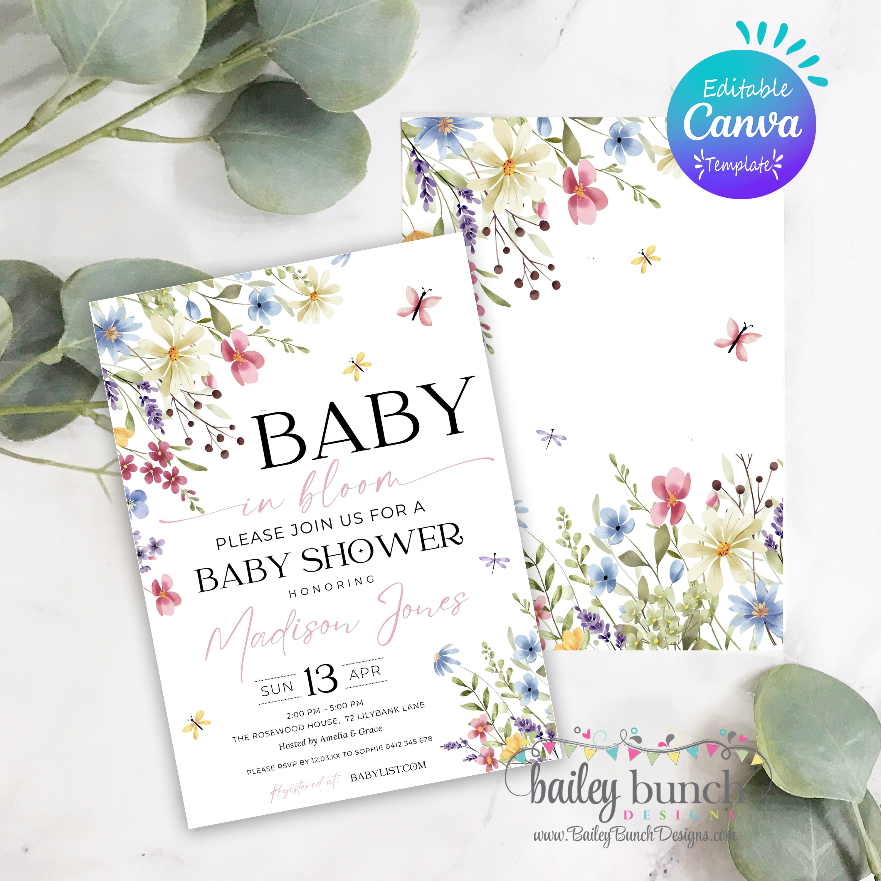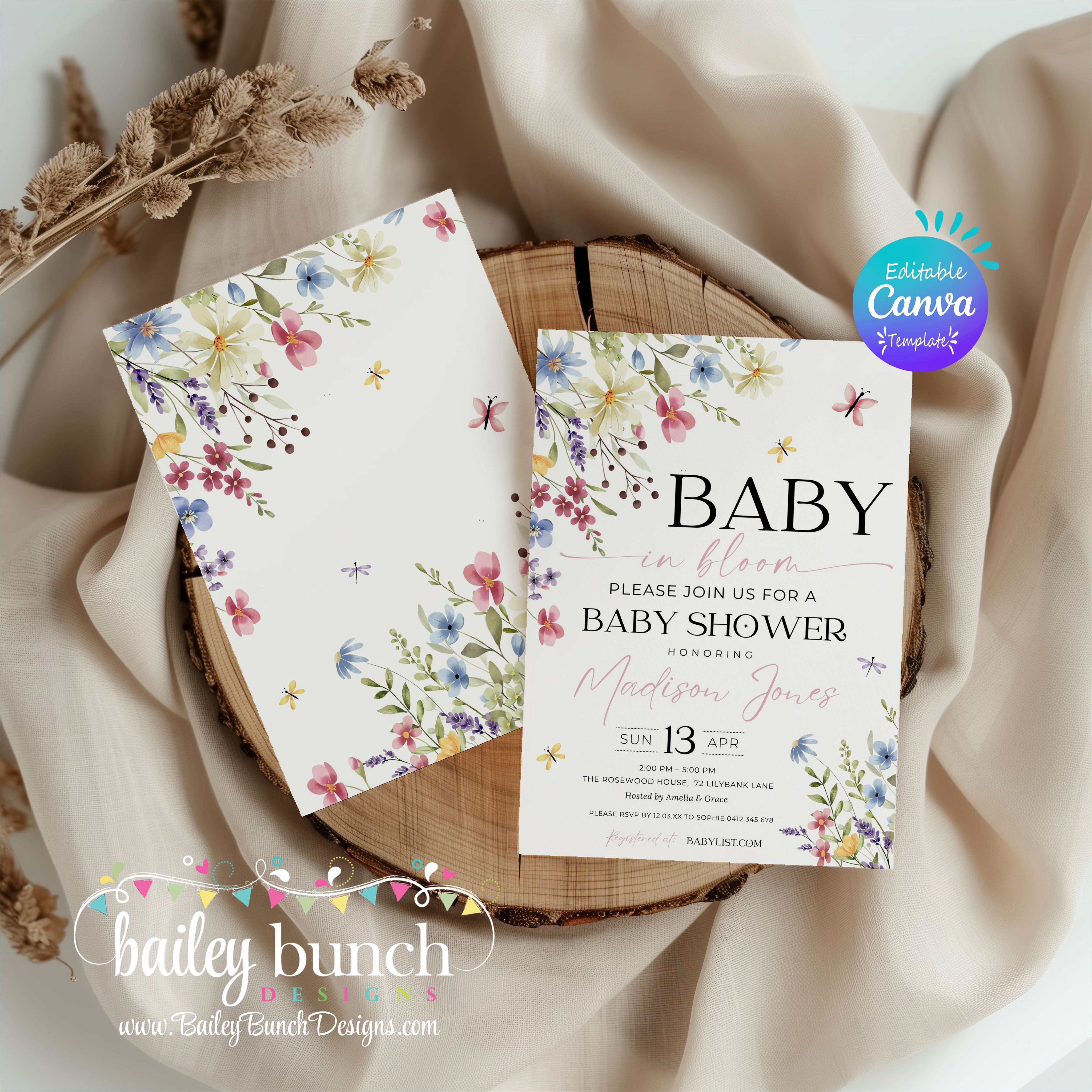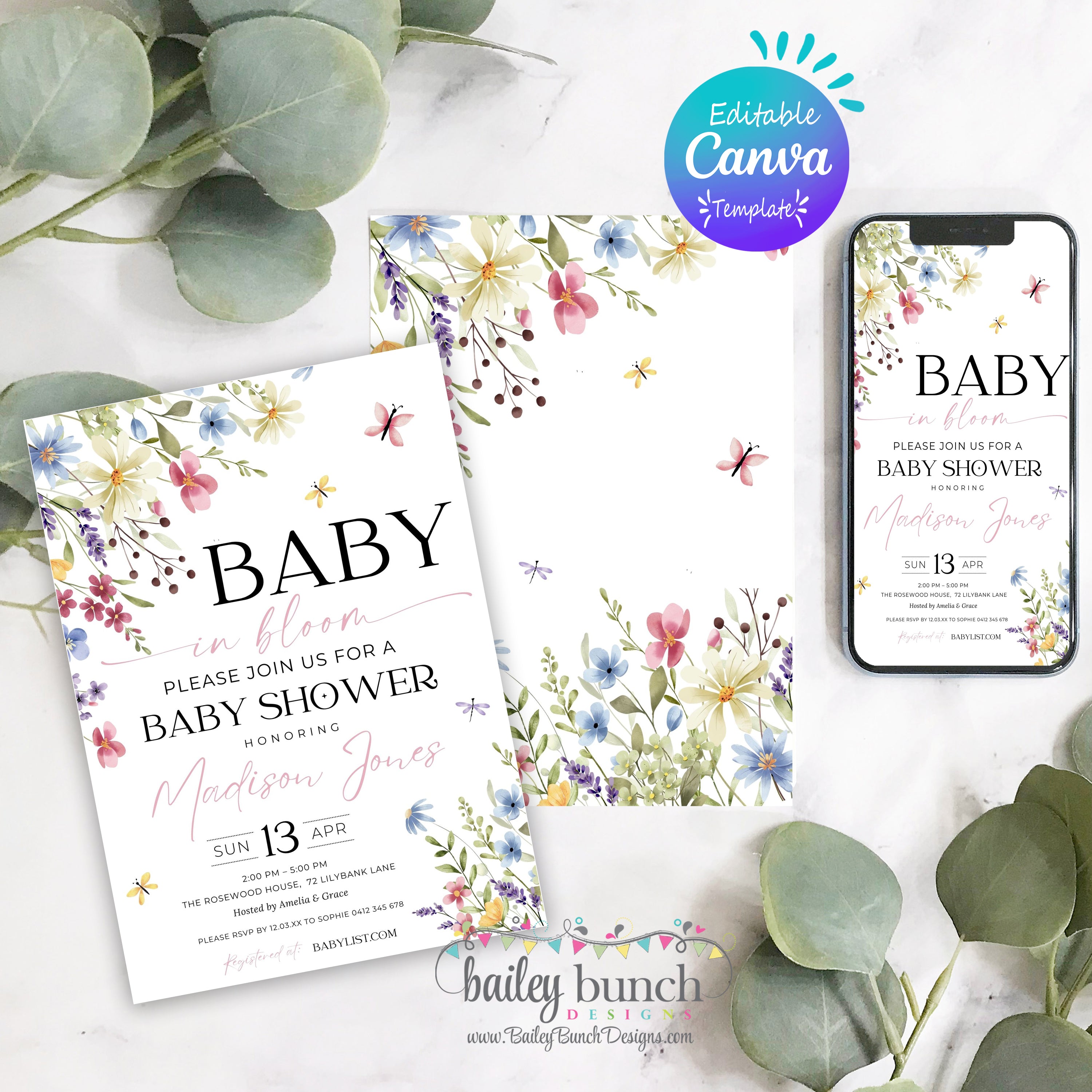 Introducing our Baby In Bloom Wildflower editable baby shower invitation, designed to brighten up your special day with a touch of spring with watercolor wildflowers and elegant font. This set features both 5x7 invitation and a mobile-friendly version, enabling you to effortlessly share the joyful news with friends and family. With its delightful wildflower theme, this invitation set is the perfect way to celebrate the arrival of your little one and ensure a memorable baby shower.