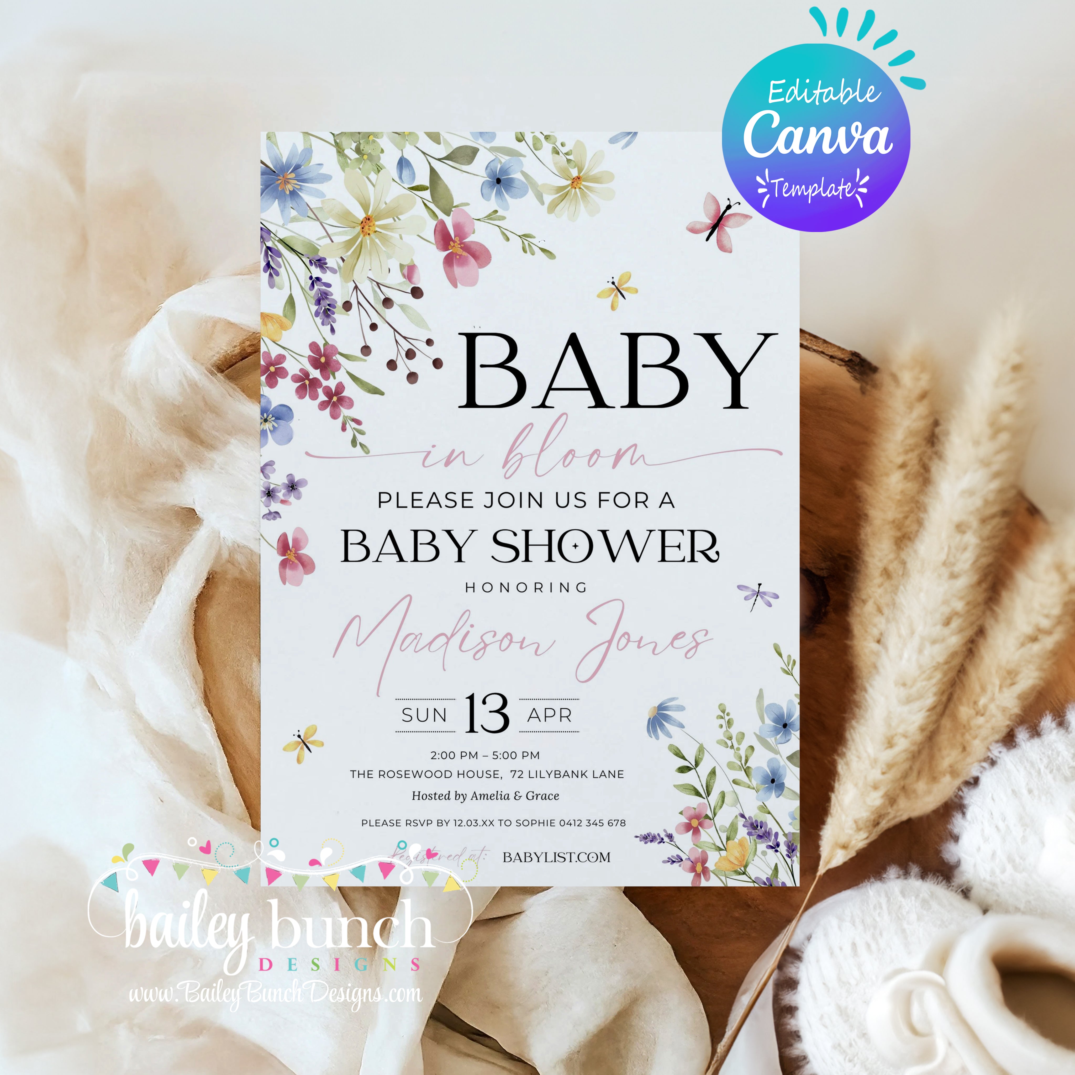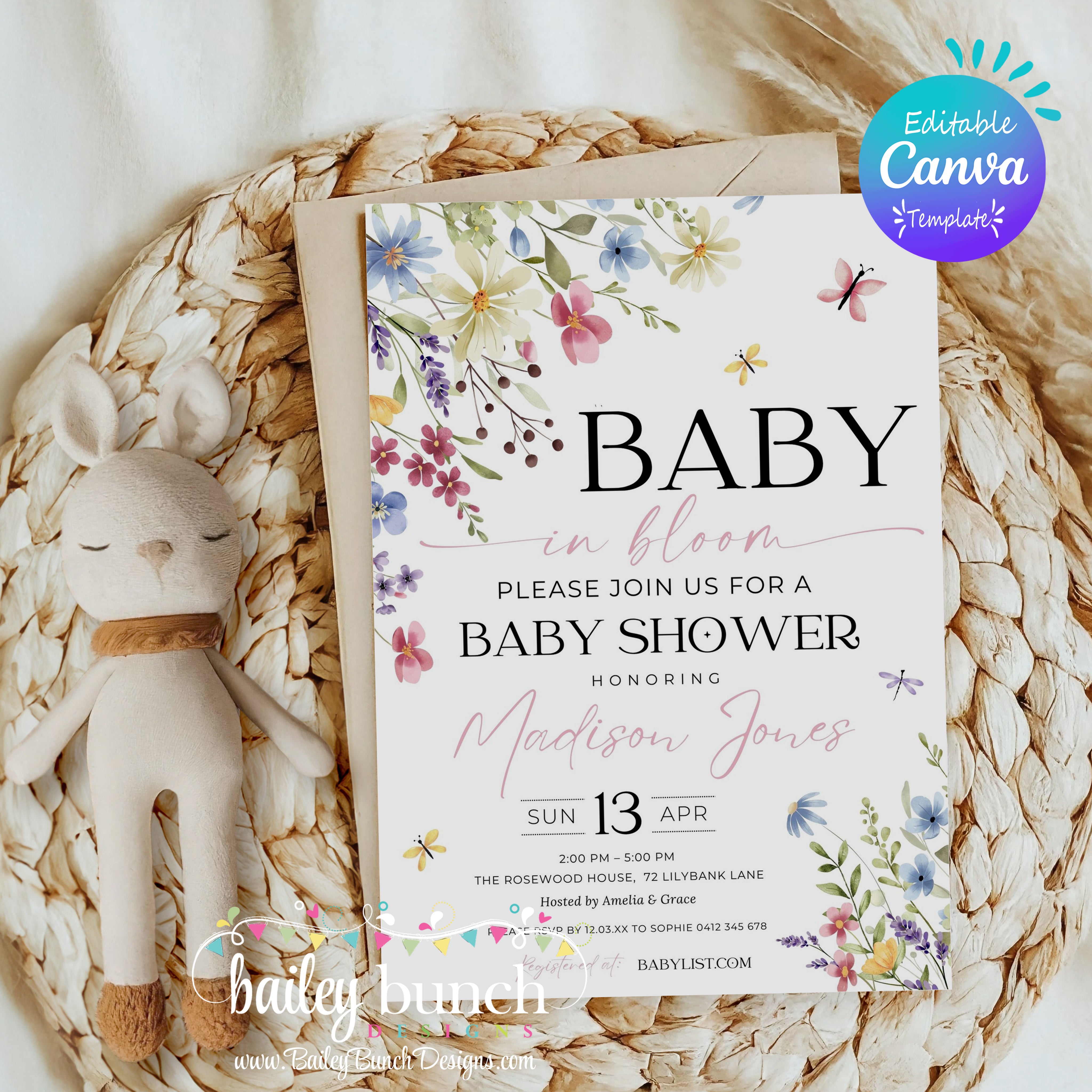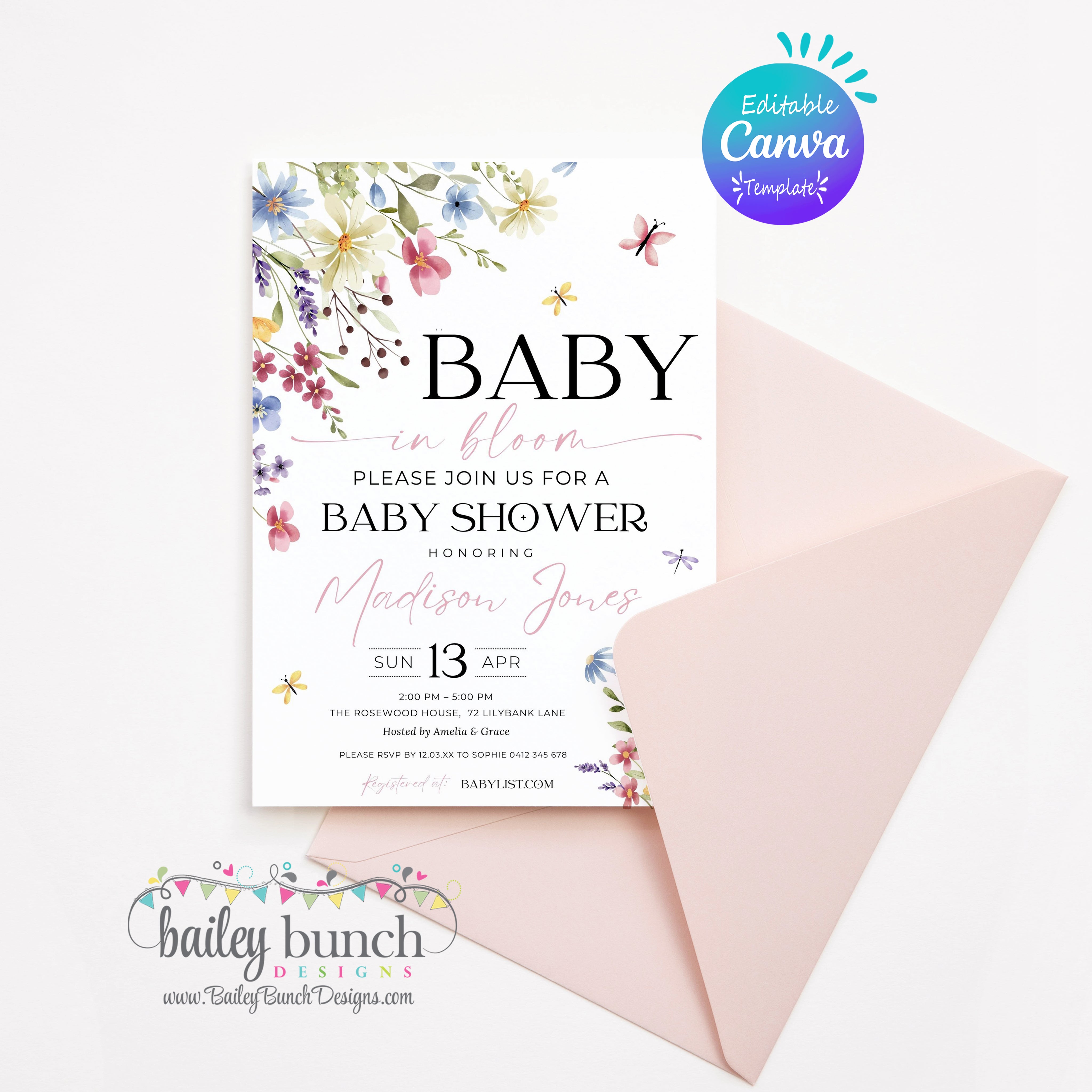 Introducing our Baby In Bloom Wildflower editable baby shower invitation, designed to brighten up your special day with a touch of spring with watercolor wildflowers and elegant font. This set features both 5x7 invitation and a mobile-friendly version, enabling you to effortlessly share the joyful news with friends and family. With its delightful wildflower theme, this invitation set is the perfect way to celebrate the arrival of your little one and ensure a memorable baby shower.