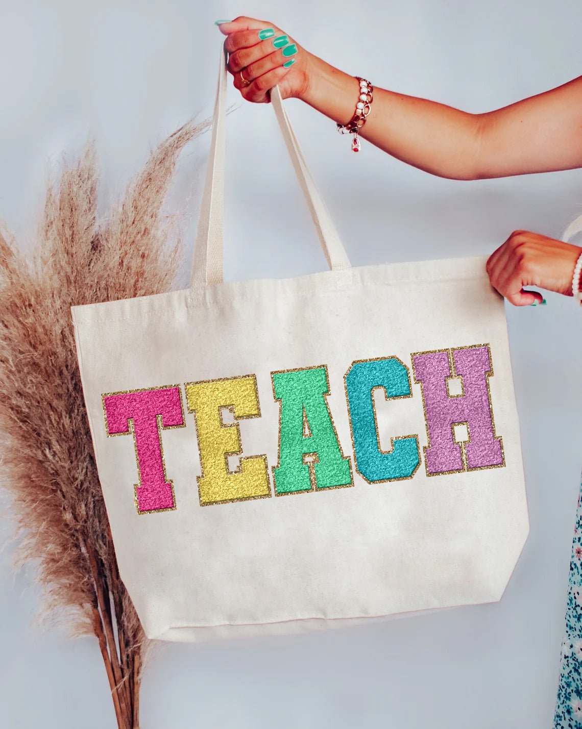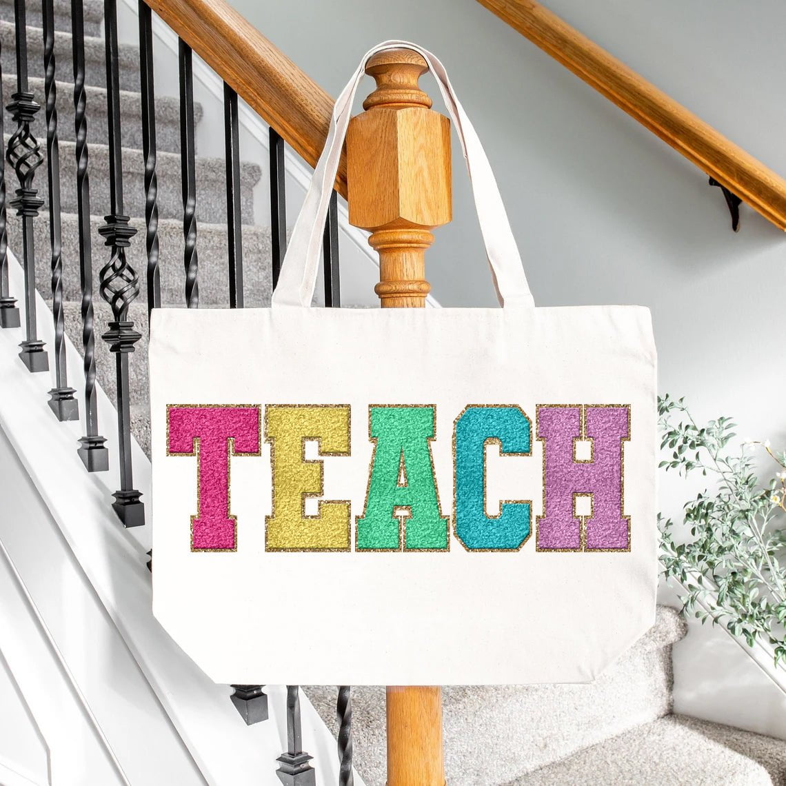 The CUTEST Personalized Tote for Teacher Appreciation with Sublimation TEACH in Faux Chenille Varsity Patch Letters!