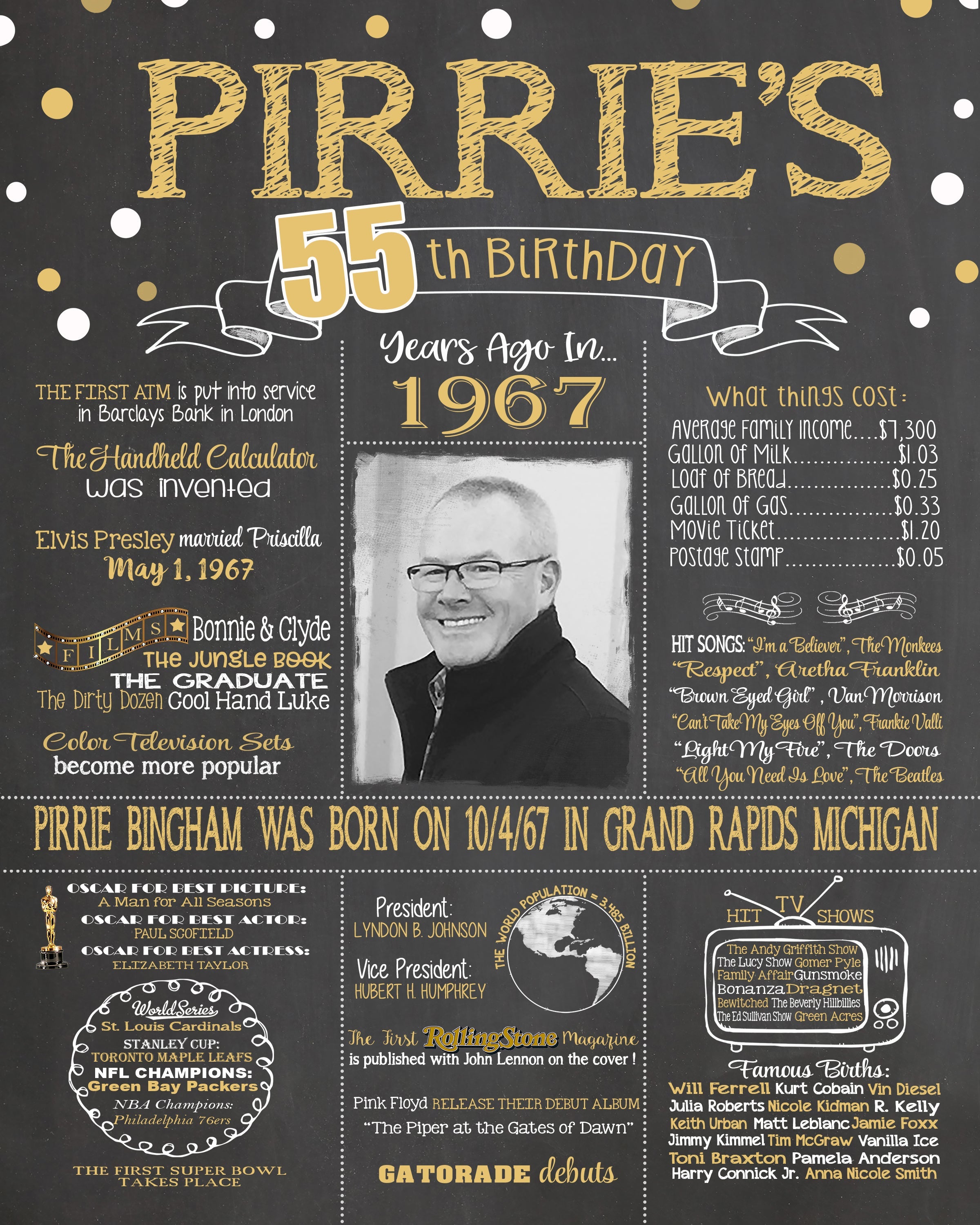 55th PHOTO Birthday Chalkboard, 1967 Poster, 55th Birthday Gift