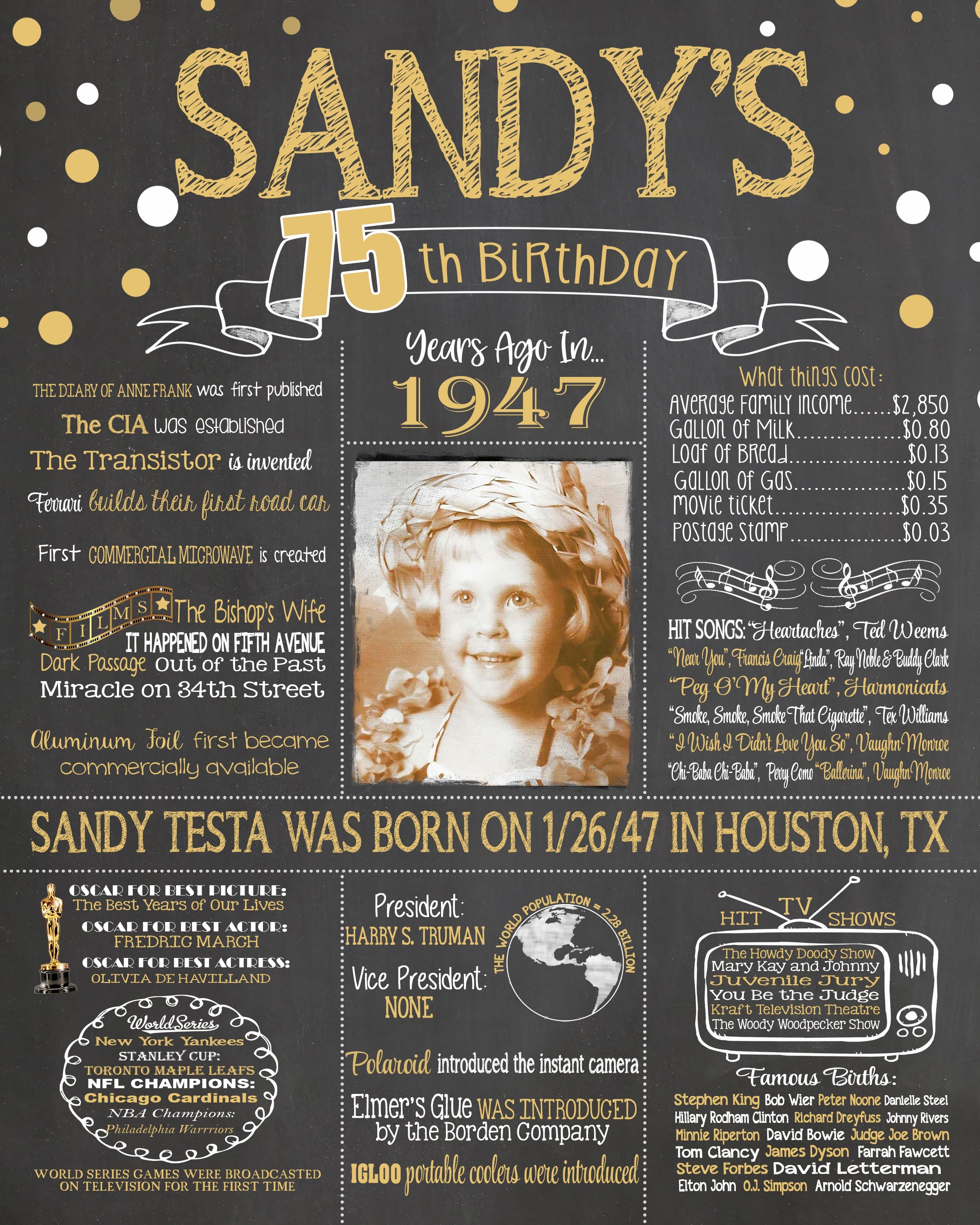 2022 Design - Birthday Sign, 75th Birthday Photo Chalkboard, Back in 1947 Board 75PIC19440520