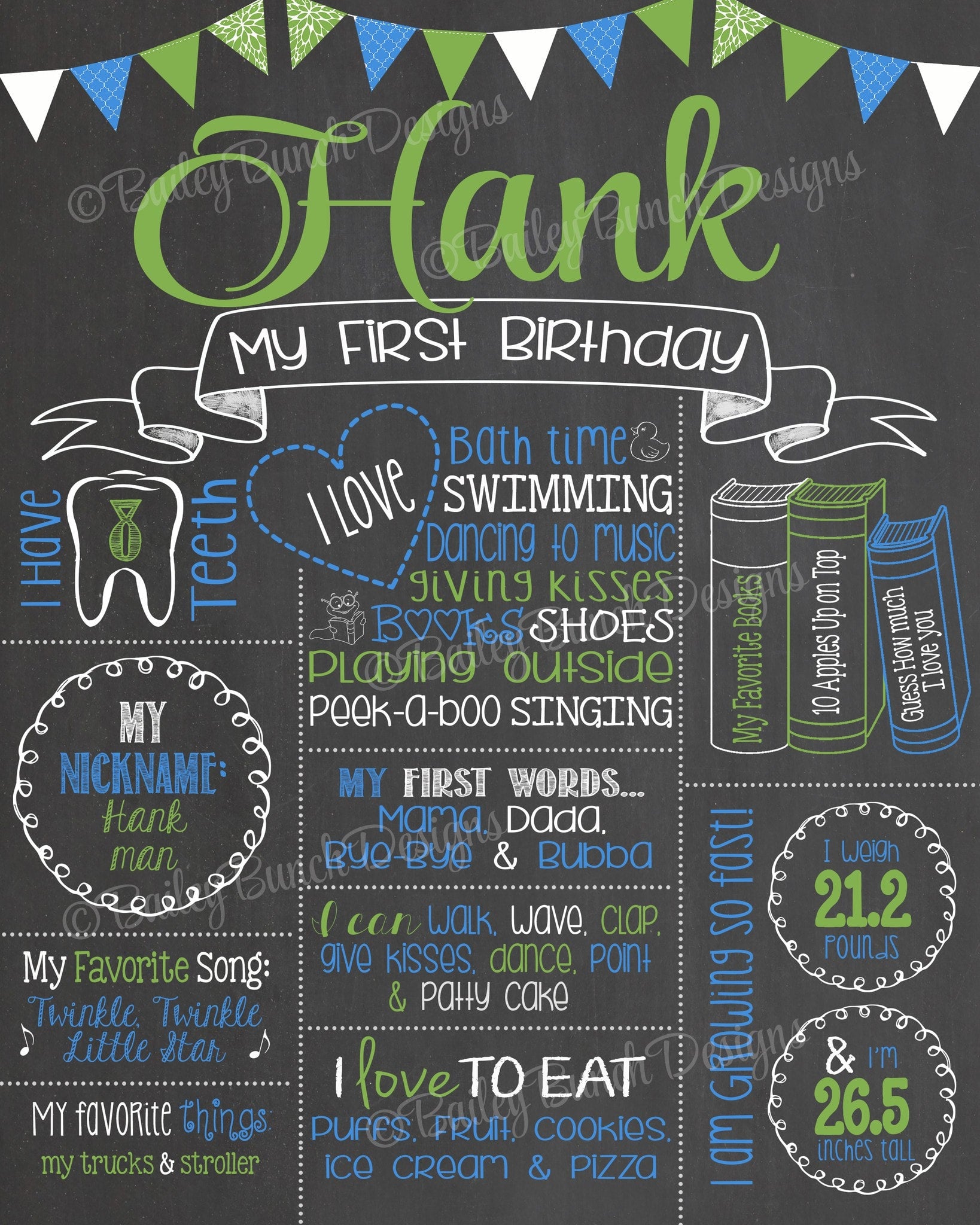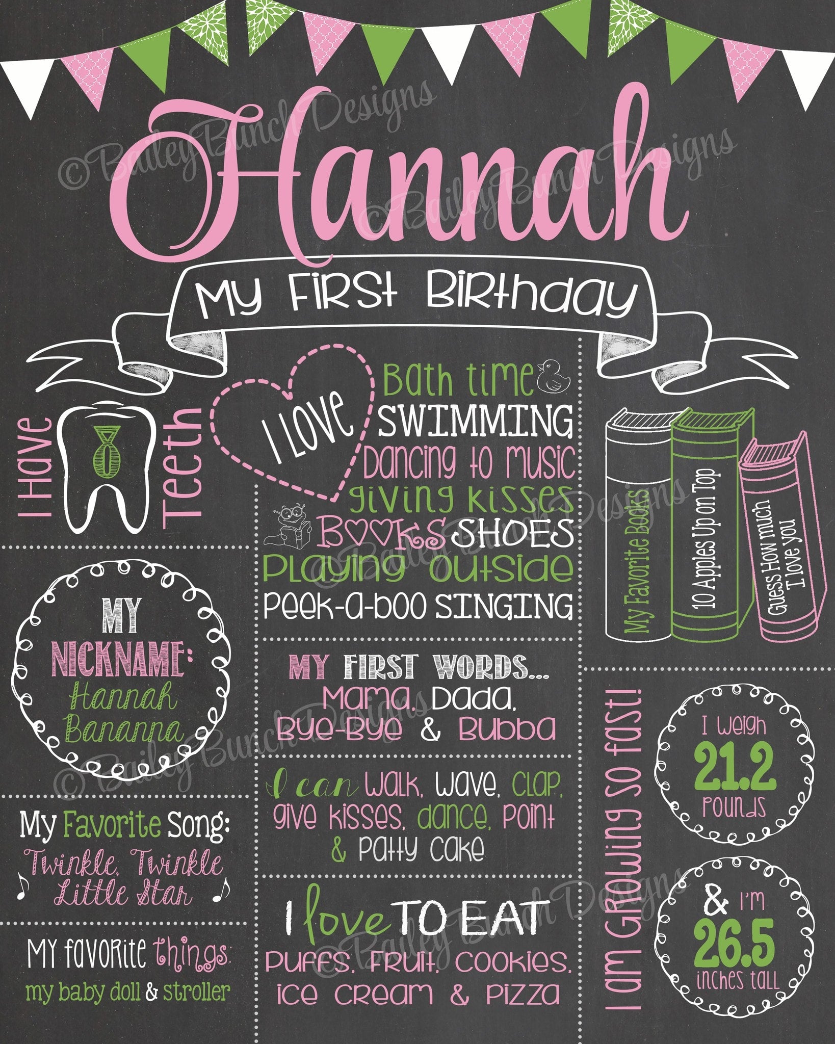 Your chalkboard can be printed at most local photo print shops: walgreens, walmart, staples, fedex kinkos, office depot, etc The file may be printed on card stock or regular paper and then mounted onto foam board or placed in a frame. Most office supply stores will print the poster and mount it on foam board for you! The ways of presenting your child's first birthday poster are endless: you could frame it, mount it on a foam board, print it on a canvas, or even share it digitally on facebook or thru email.