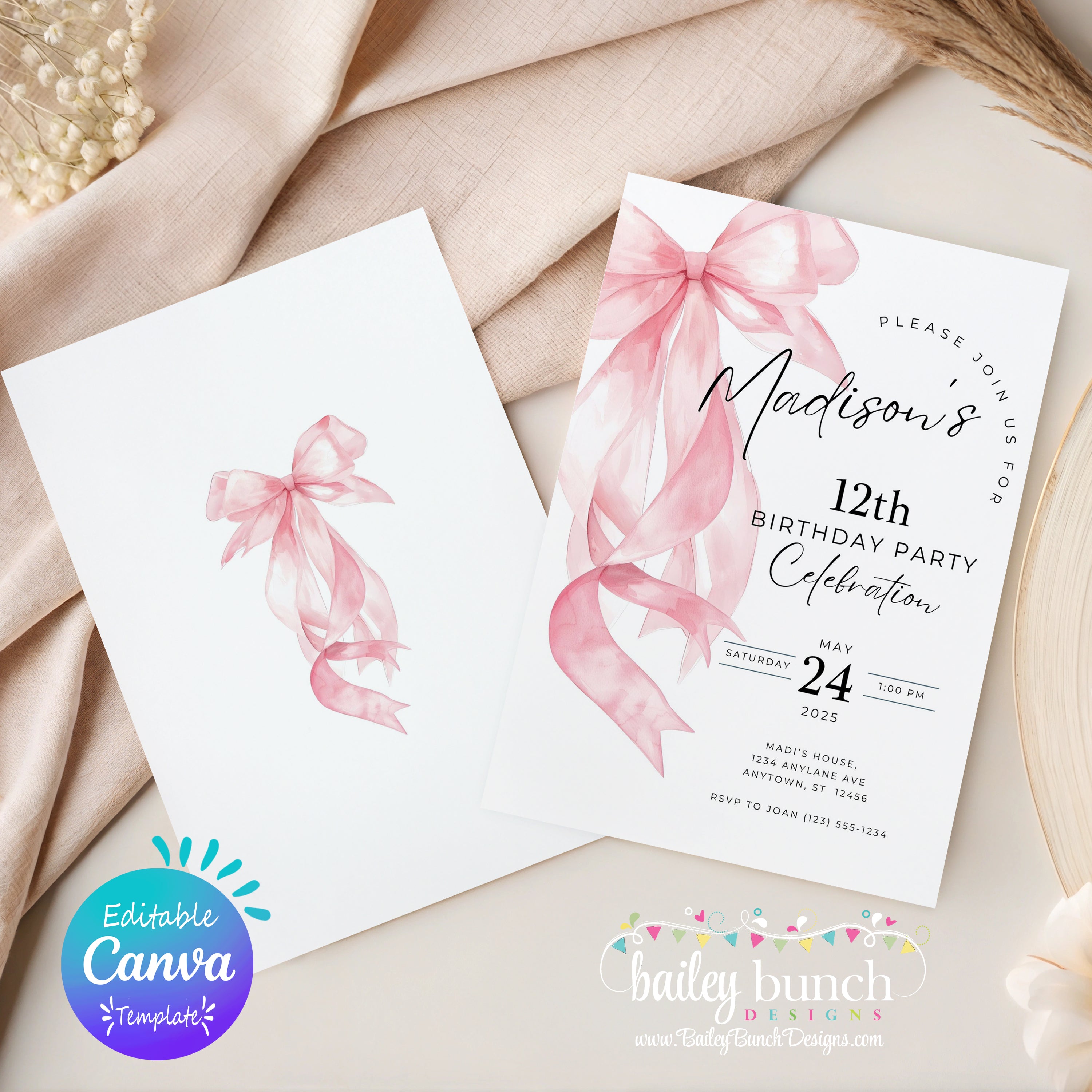 π Personalized Pink Bow Tween Birthday Invitation π ANY AGE! Editable Template | 5x7" JPG, PDF, Double Sided, Back Design & phone invite included!