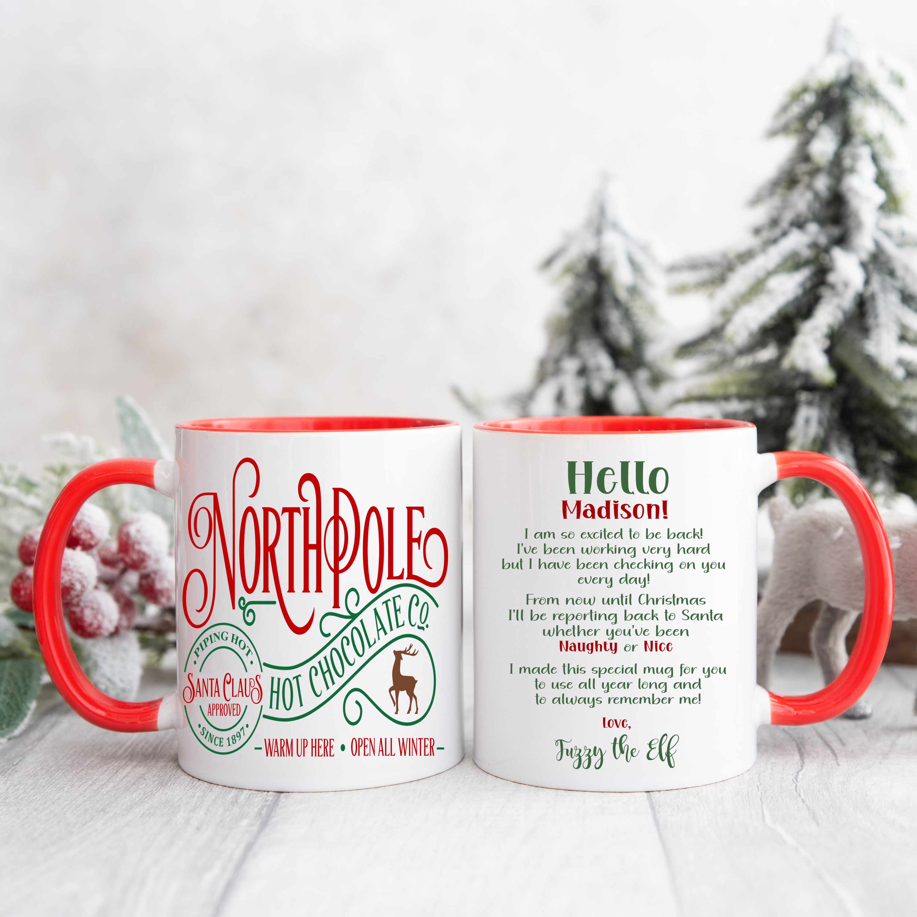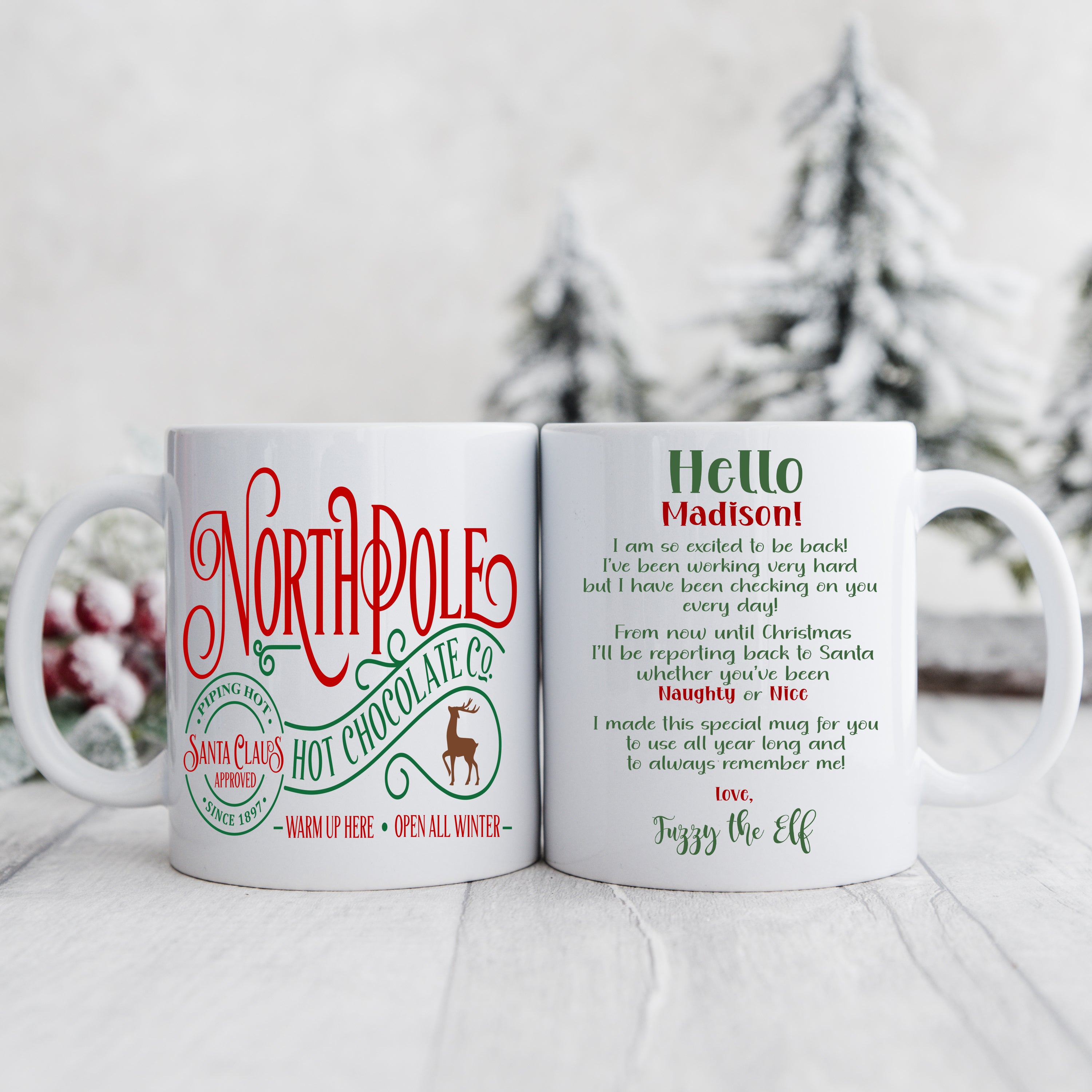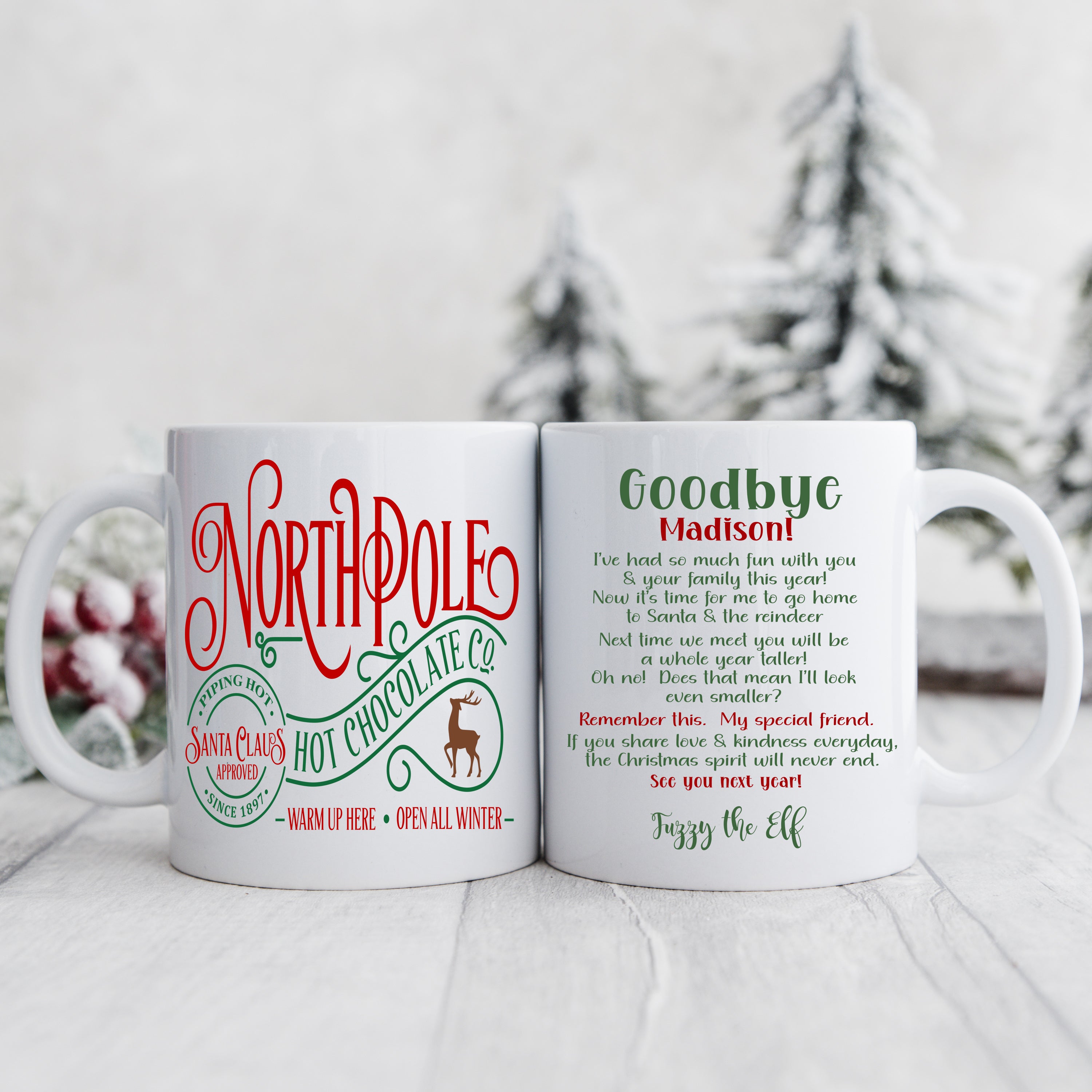 Personalized Elf Hot Chocolate Mug from the North Pole with your child’s name and message from their Elf. . These personalized hot chocolate mugs are the perfect way for your little one to welcome or say goodbye to their elf and enjoy a warm cup of hot cocoa.  Makes a wonderful Christmas Eve gift, party favors and is a PERFECT addition to your hot chocolate bar!