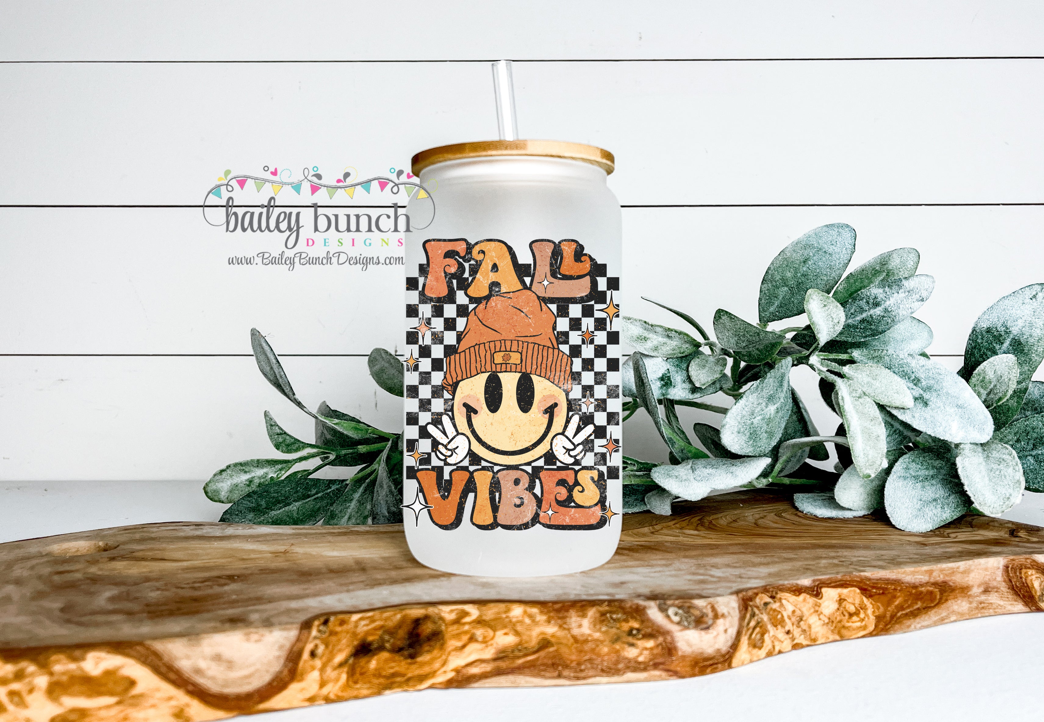 FALL VIBES SMILEY FACE Frosted Glass Cup Libbey Can LIBBEYVIBES0520