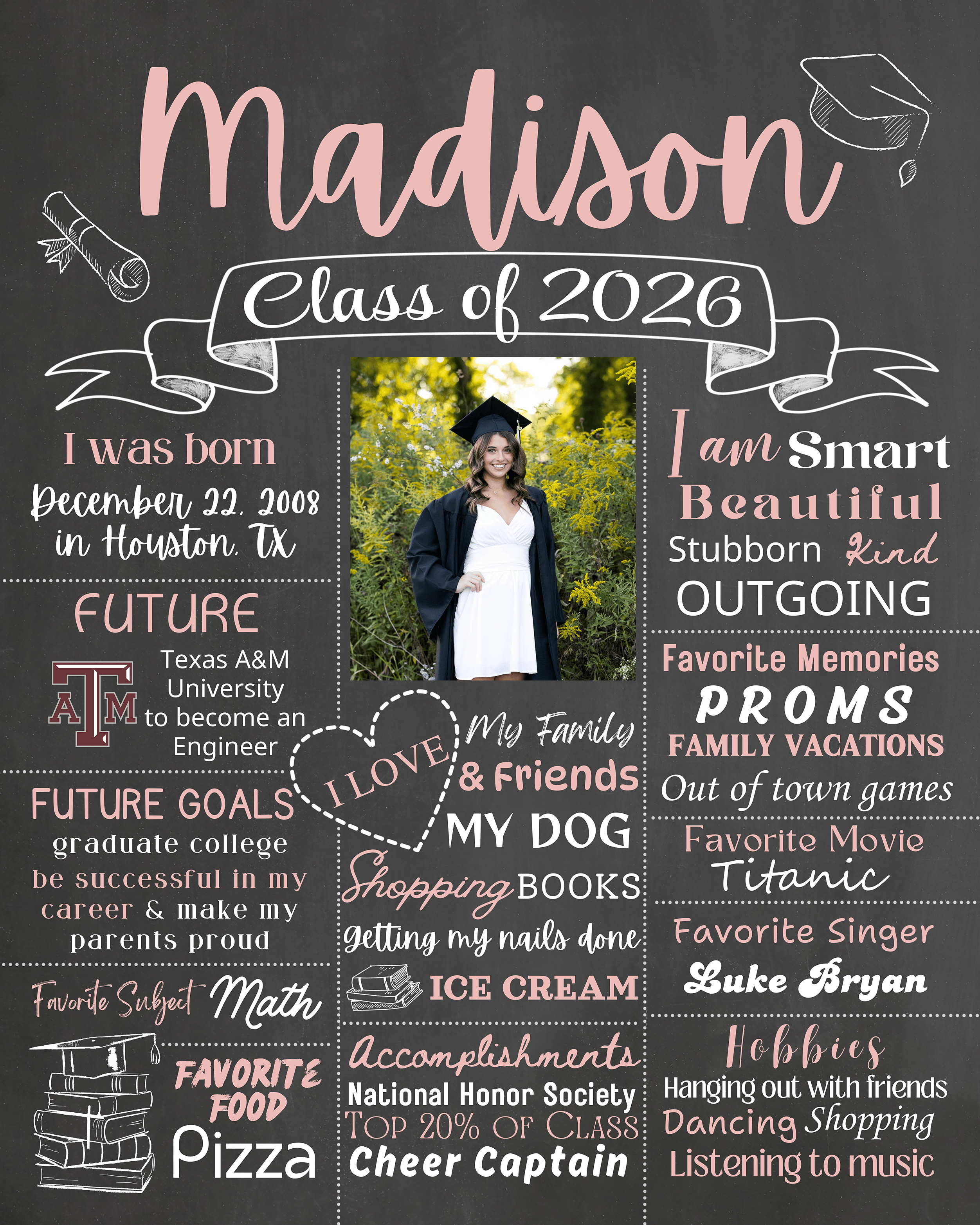 ⚠️📏This design is for the Graduation Chalkboard SIZE 16x20, 18x24 & 24x36 (can also be printed as an 8x10) and is for Class of 2026, If you need a different Size, or Year do not purchase this design. Just send me a message and I will get you a link for what you are needing.⚠️