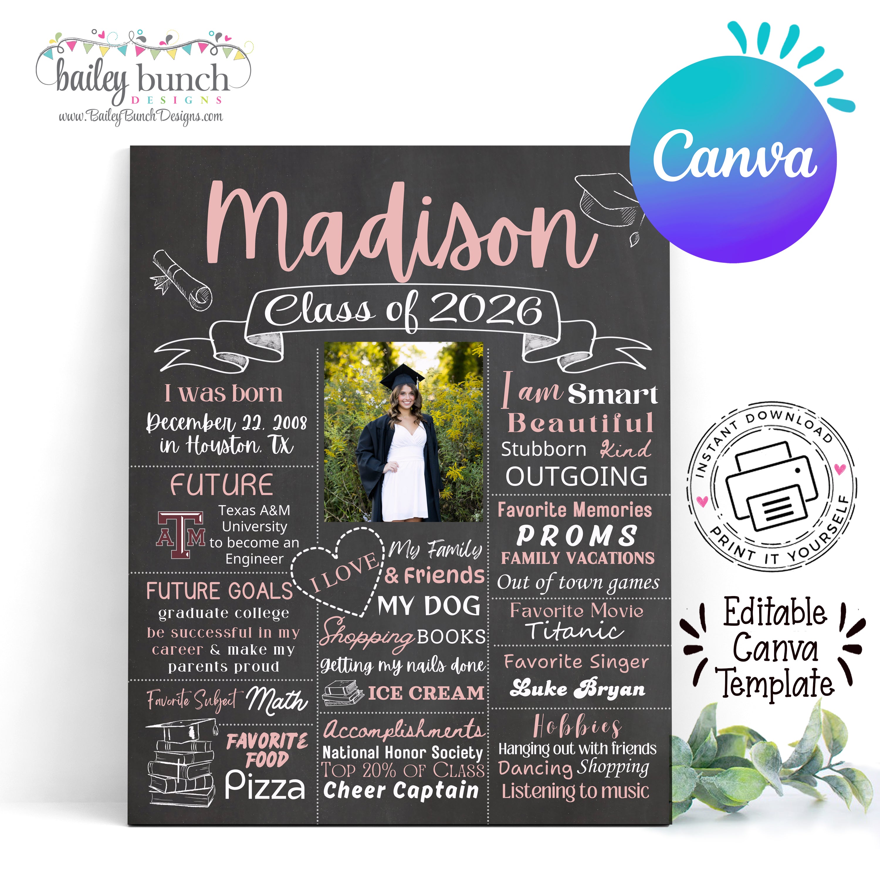 Graduation Sign Editable Canva Template, Grad PHOTO Chalkboard, Class of 2026 Board GRADTEMPLATE250520