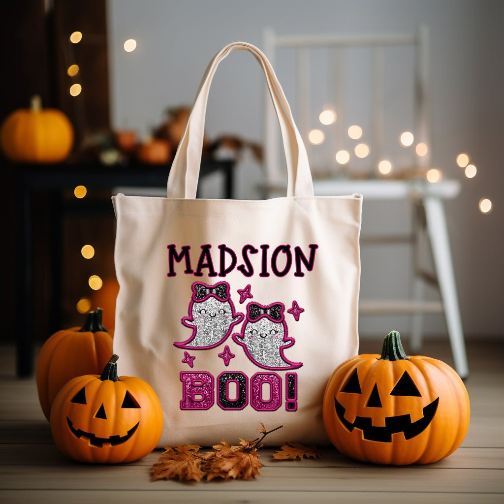 BOO Faux Embroidery Pink Ghost TRICK OR TREAT BAGS FOR HALLOWEEN