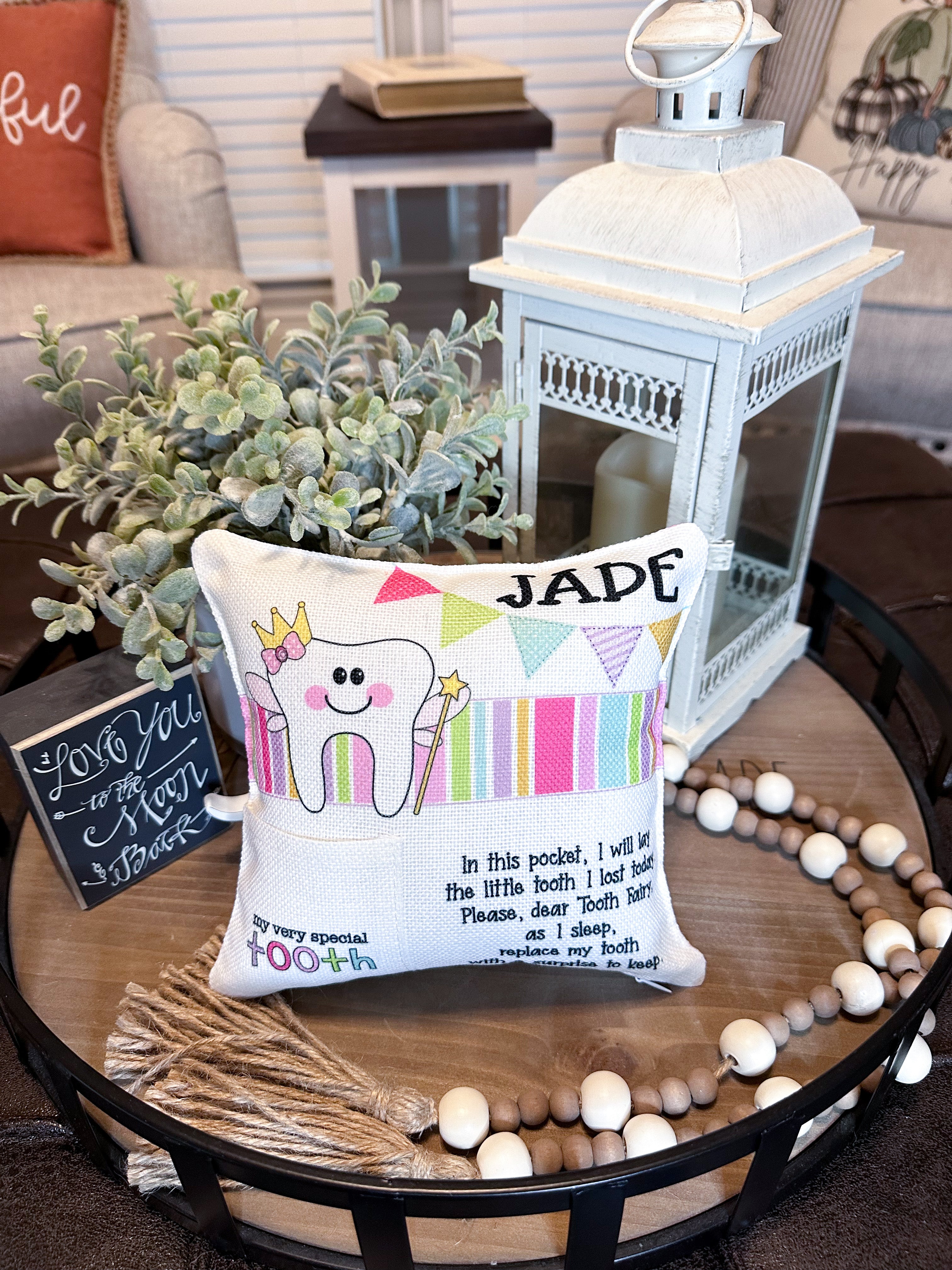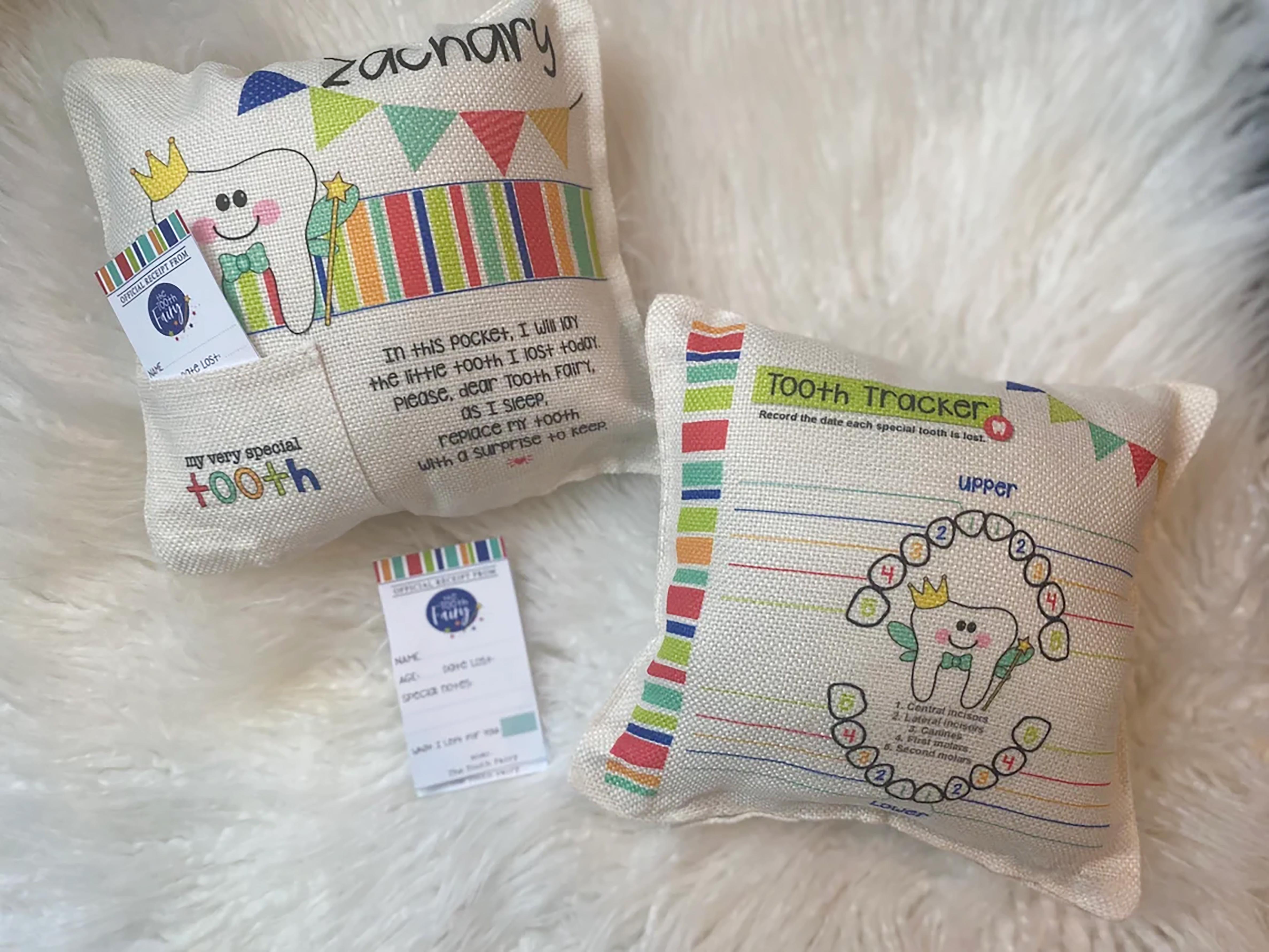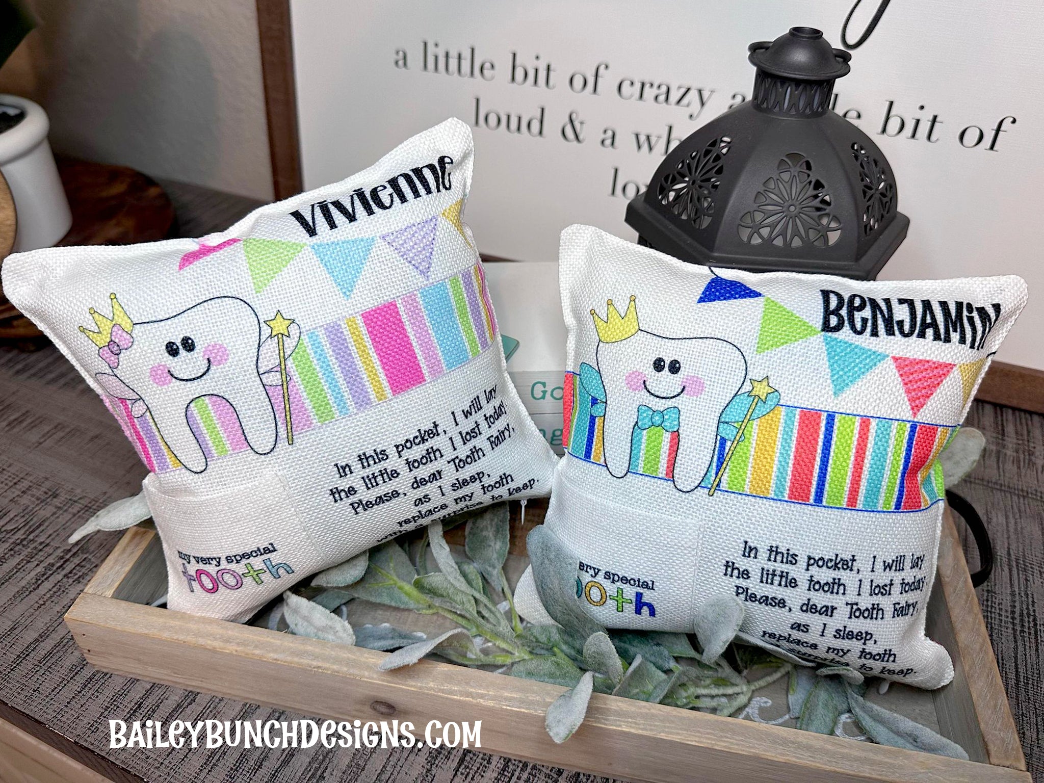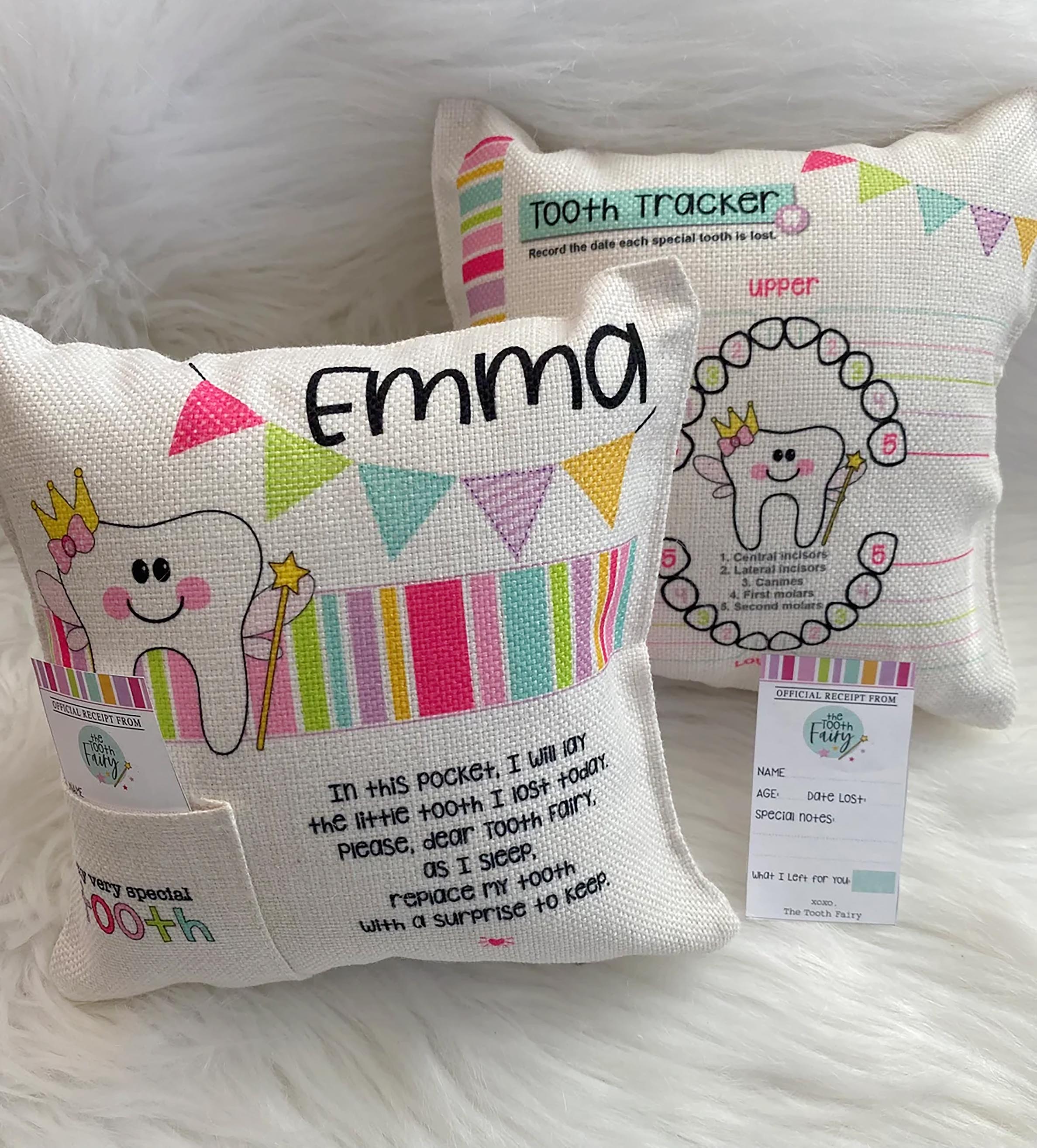Each tooth fairy pillow includes personalization with your child's name. They are 8X8 and have a pocket on the front to leave your tooth along with receipt from