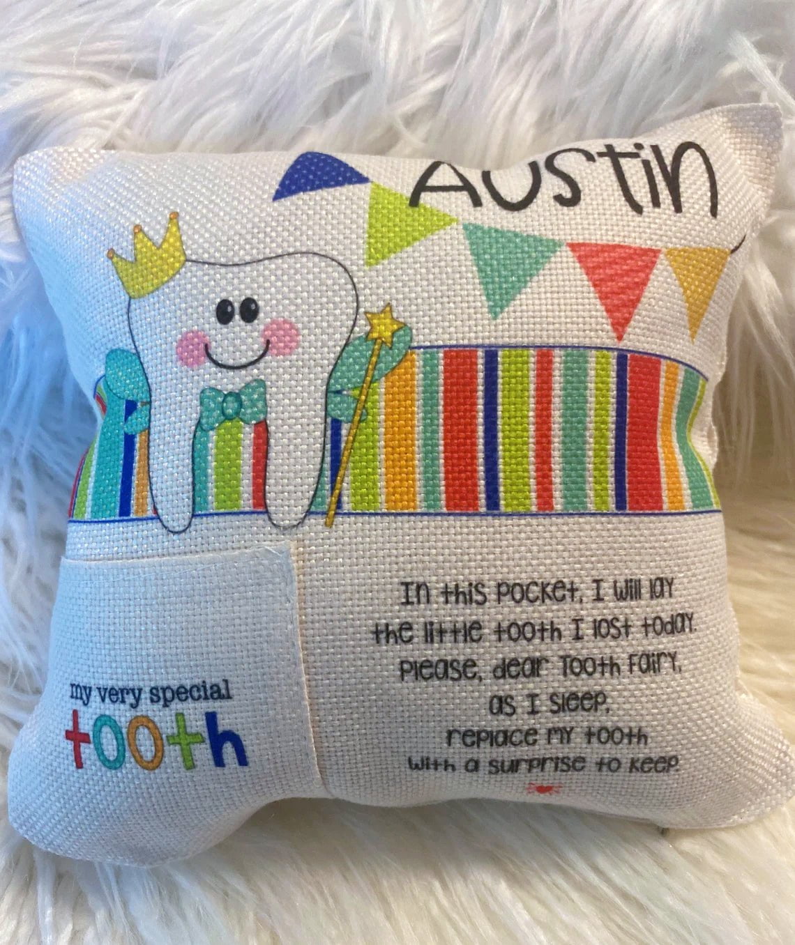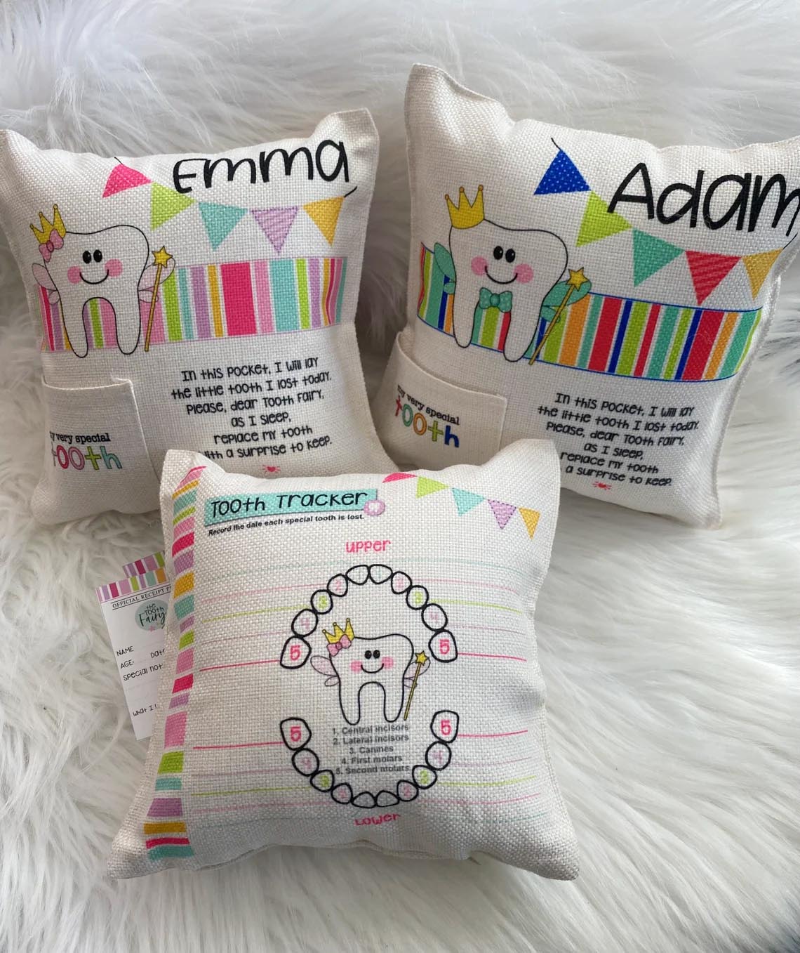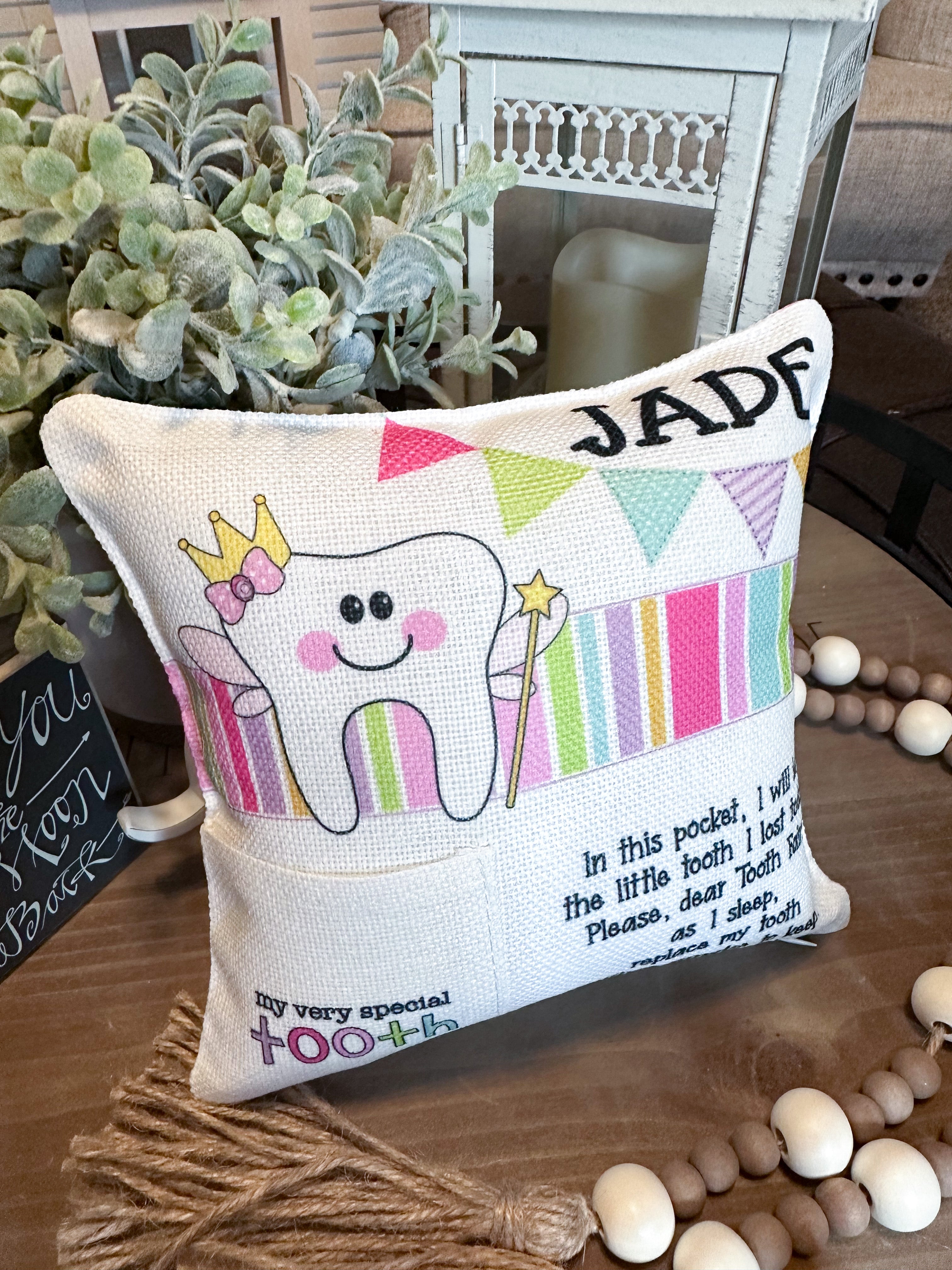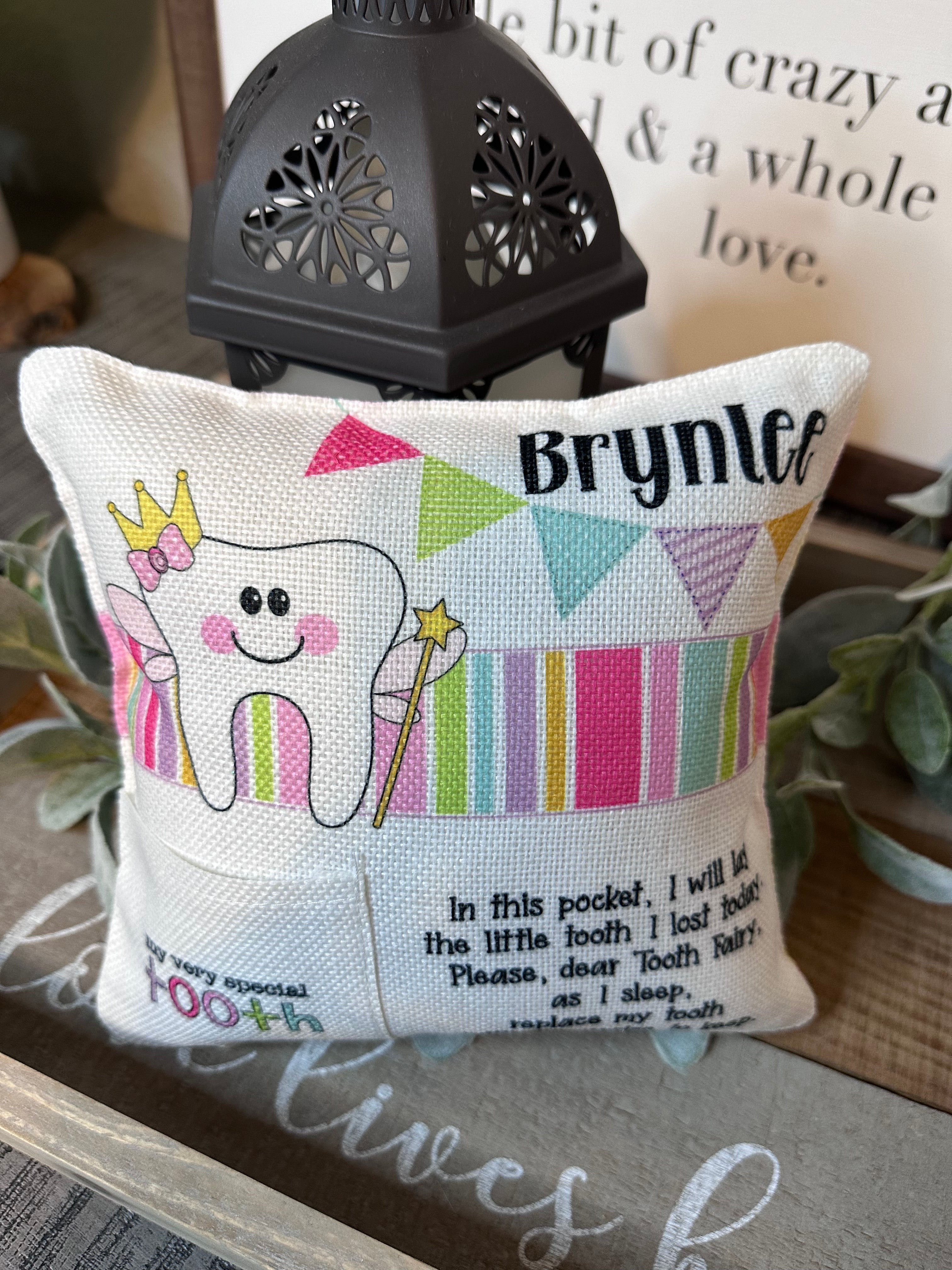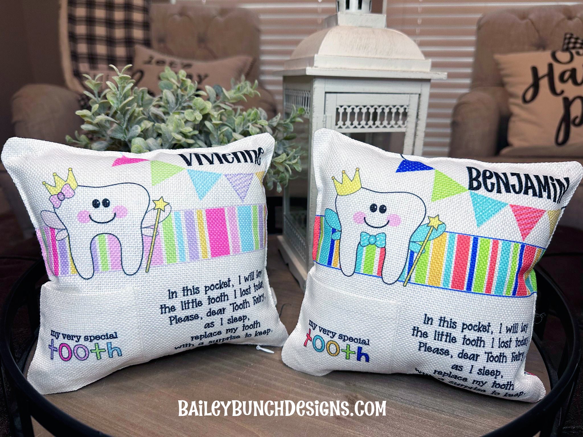 Each tooth fairy pillow includes personalization with your child's name. They are 8X8 and have a pocket on the front to leave your tooth along with receipt from