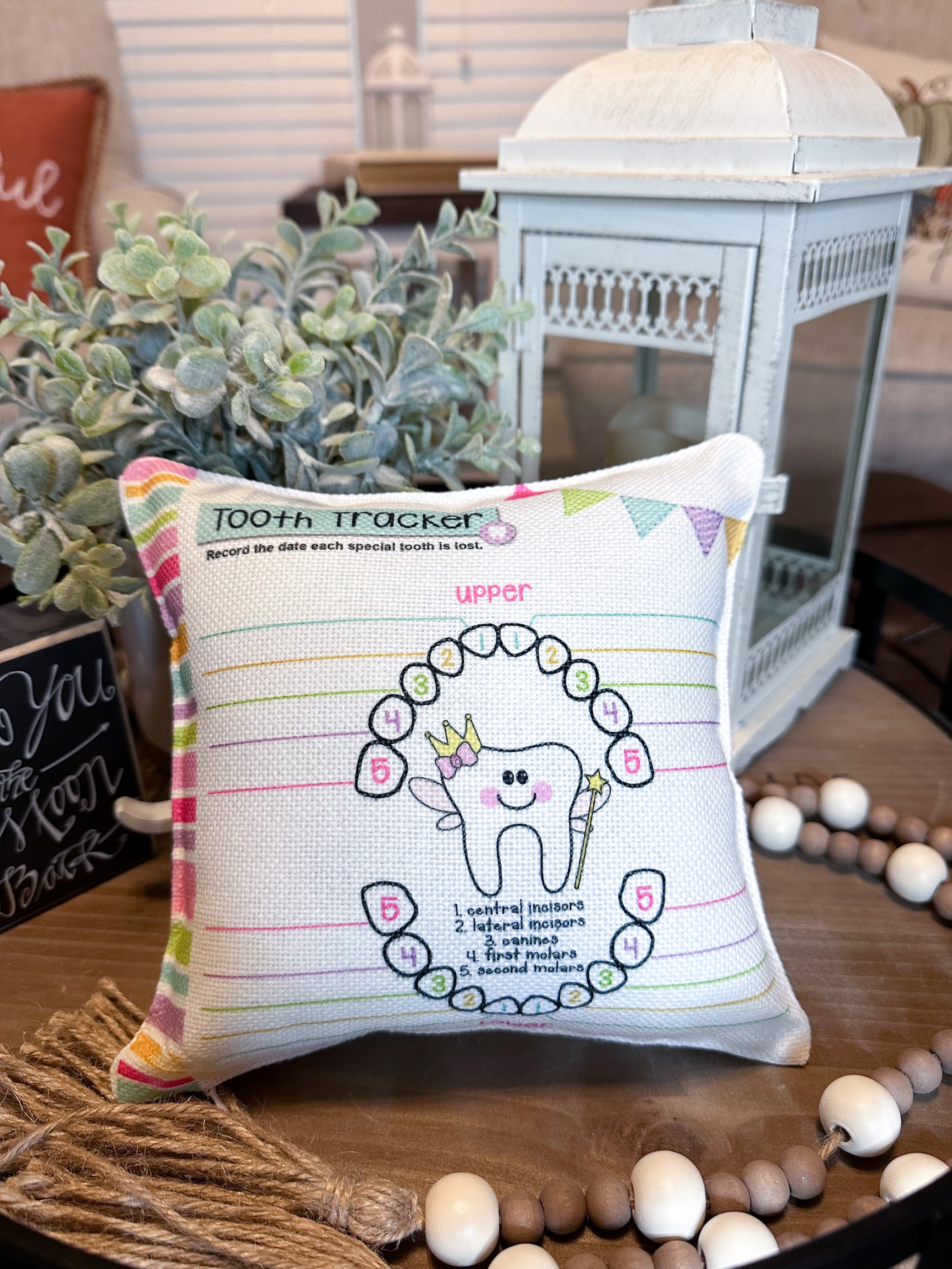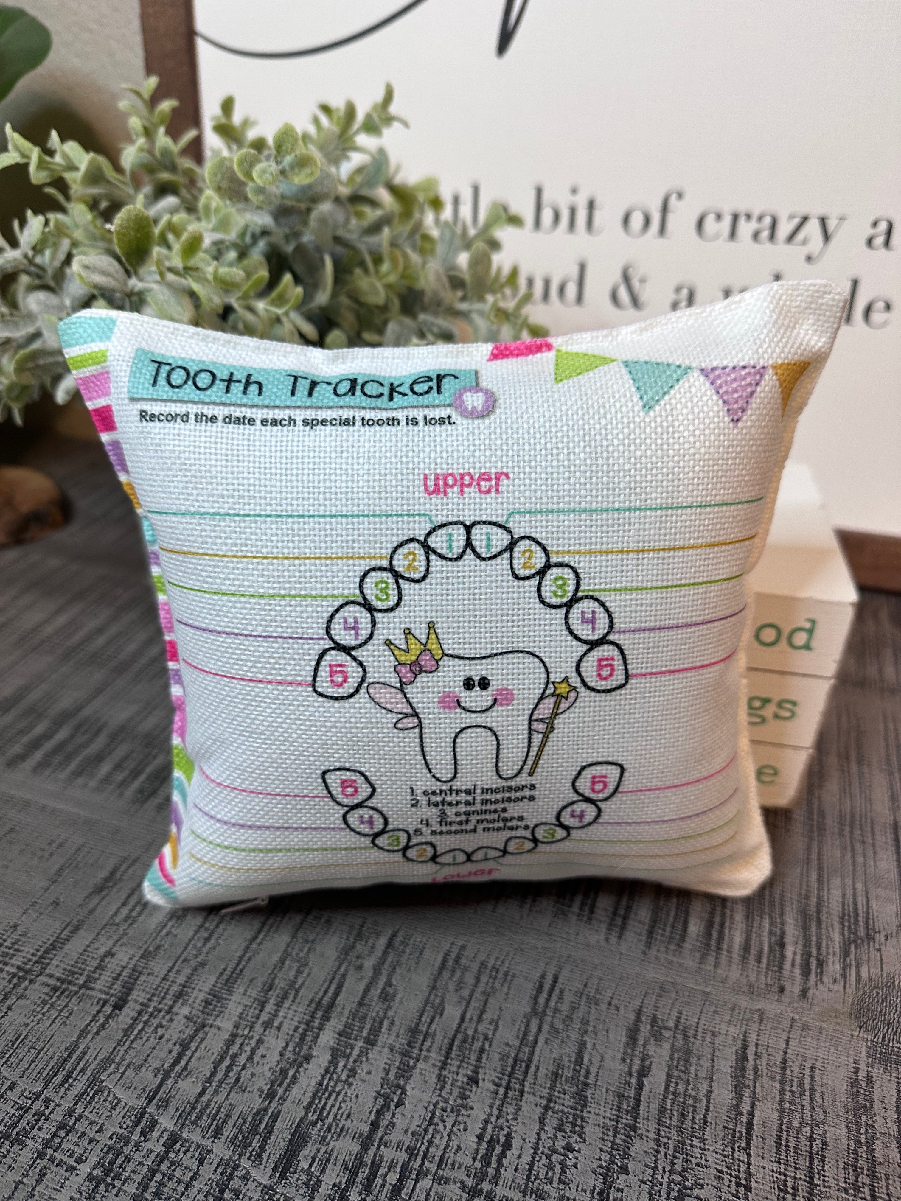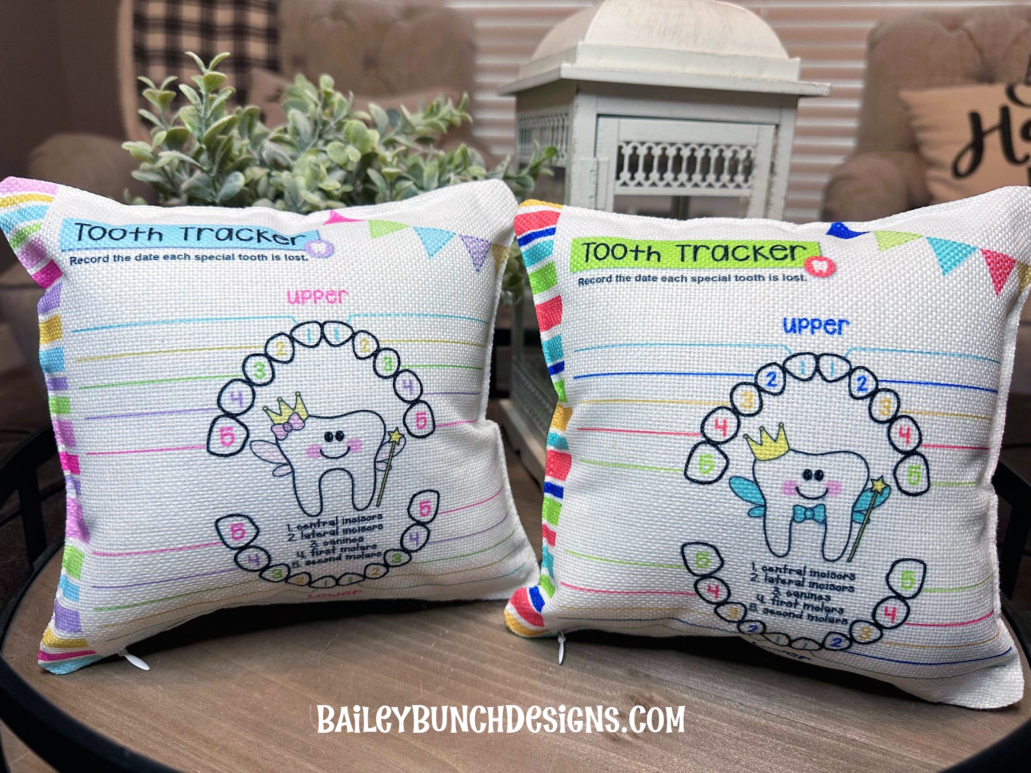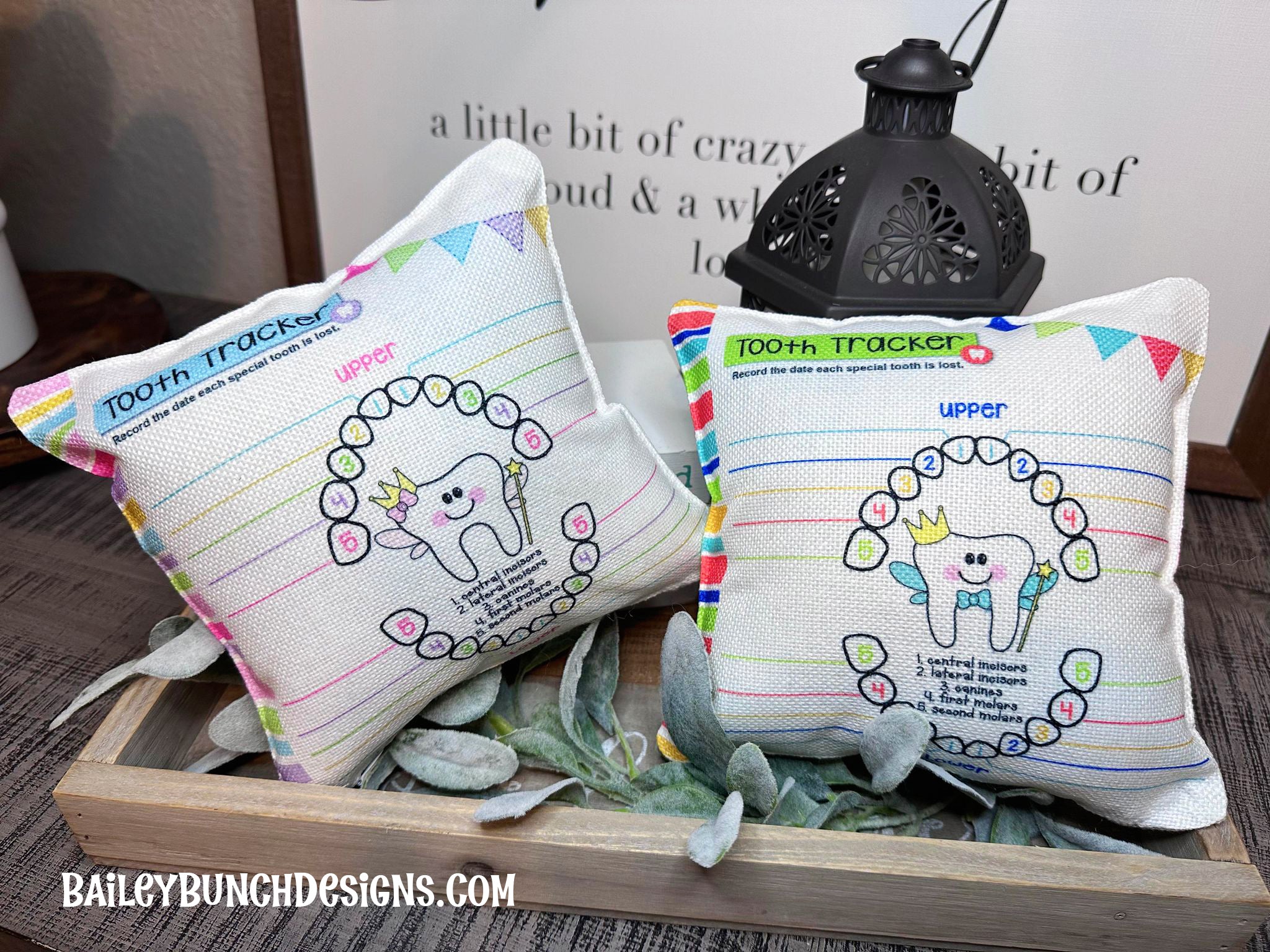 Each tooth fairy pillow includes personalization with your child's name. They are 8X8 and have a pocket on the front to leave your tooth along with receipt from