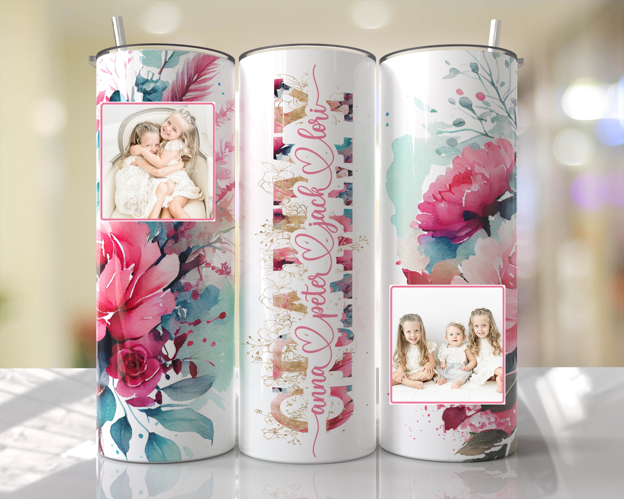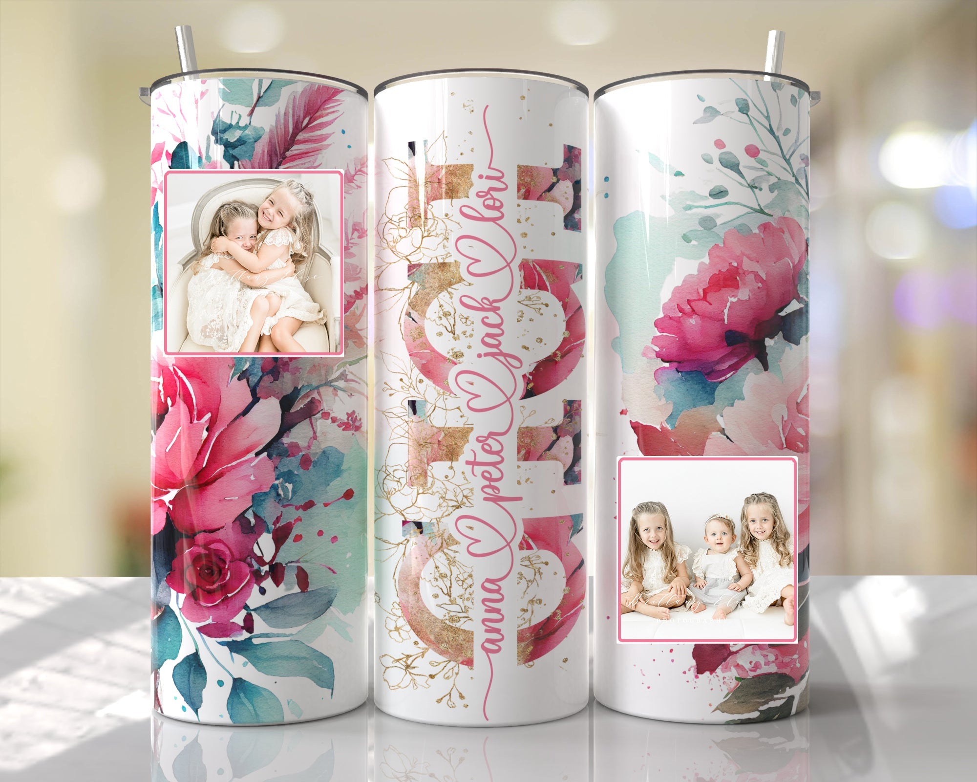 MOTHER'S DAY PINK & AQUA FLORAL WITH NAMES GLITTER TUMBLER!