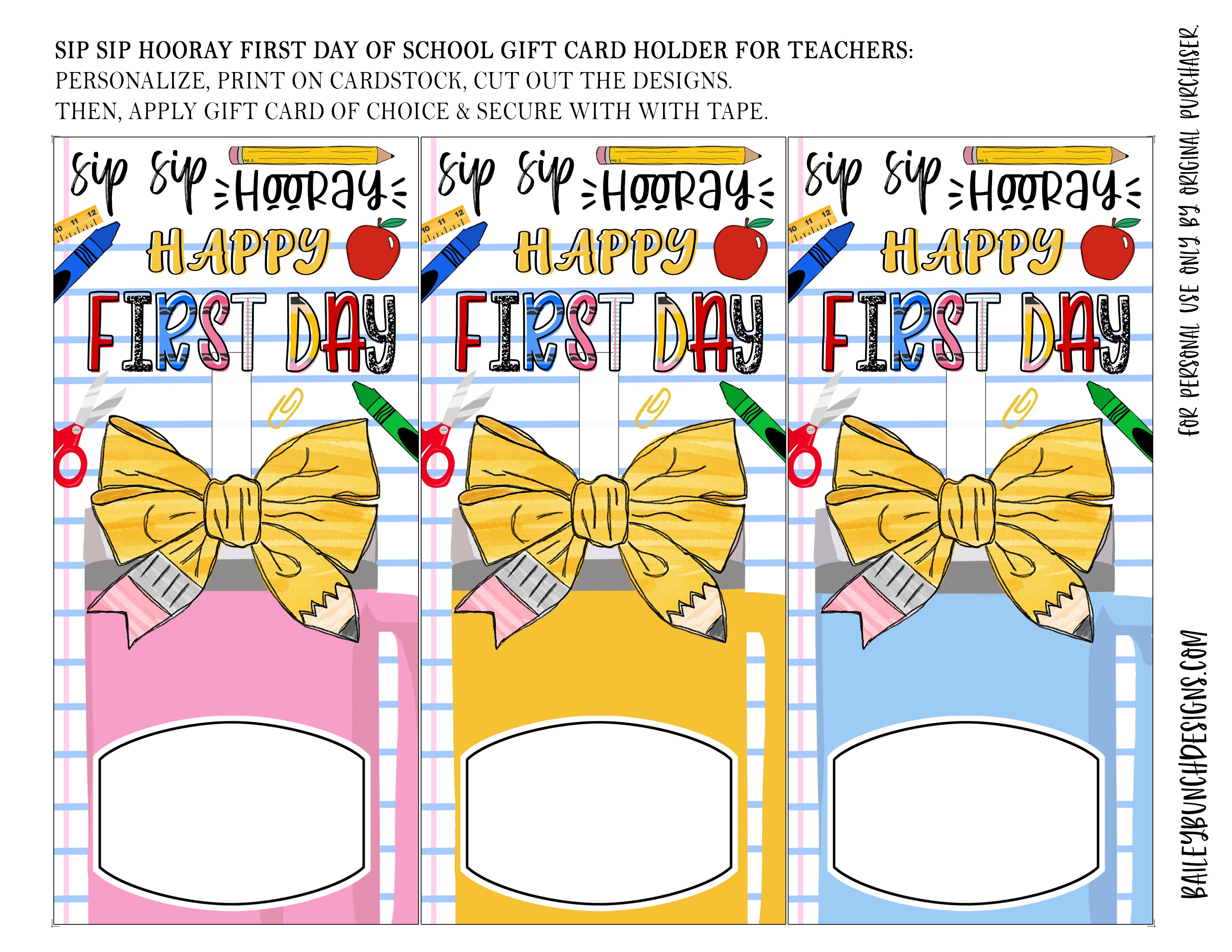 -Text at the top "Sip Sip Hooray Happy First Day"