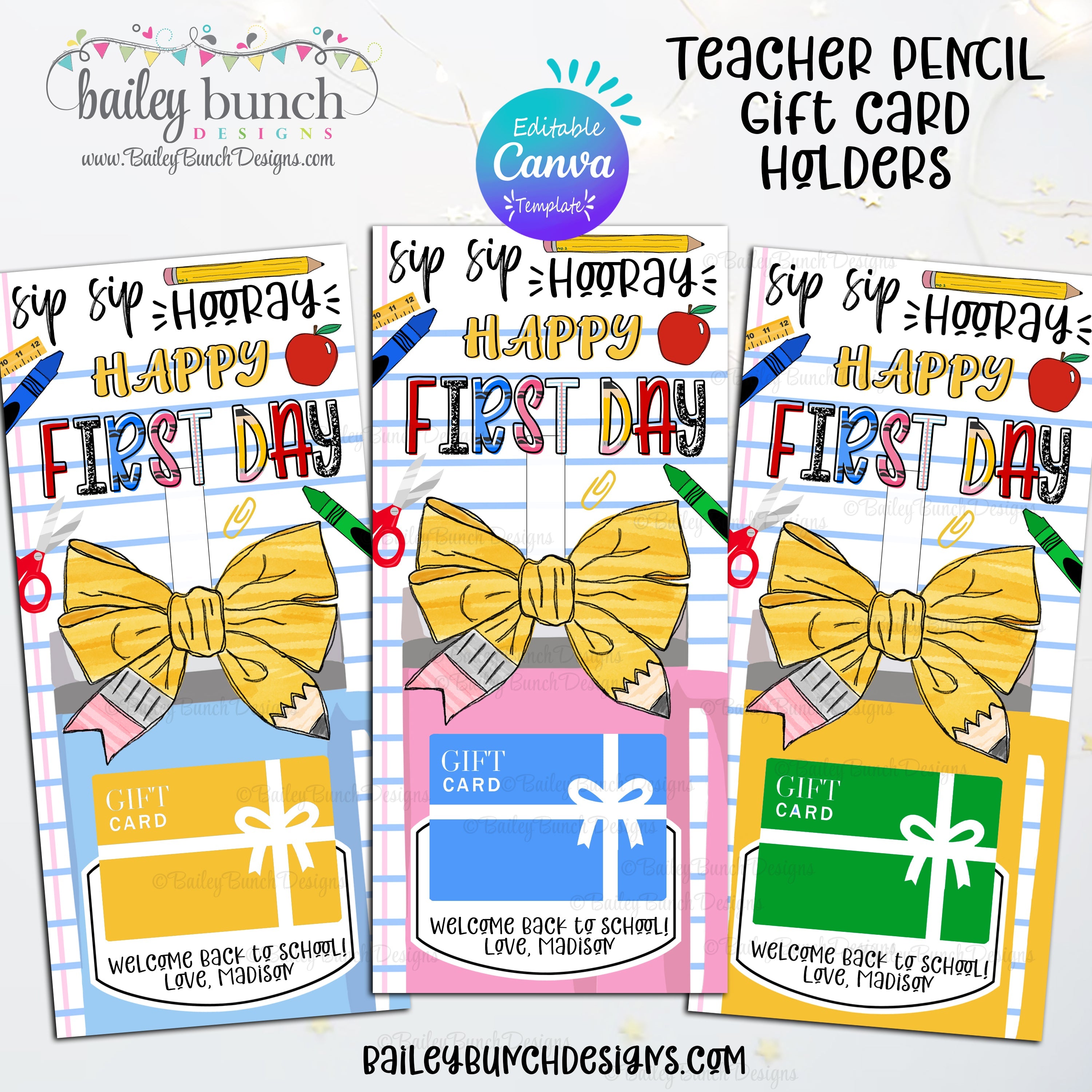 Using Canva, personalize the bottom portion of the design with any message and name you would like! Then, carefully cut our cards and add gift card of choice. Secure with tape. Β Such a cute and super fun gift to thank a special teacher in your life! What a wonderful way to start the new school year!