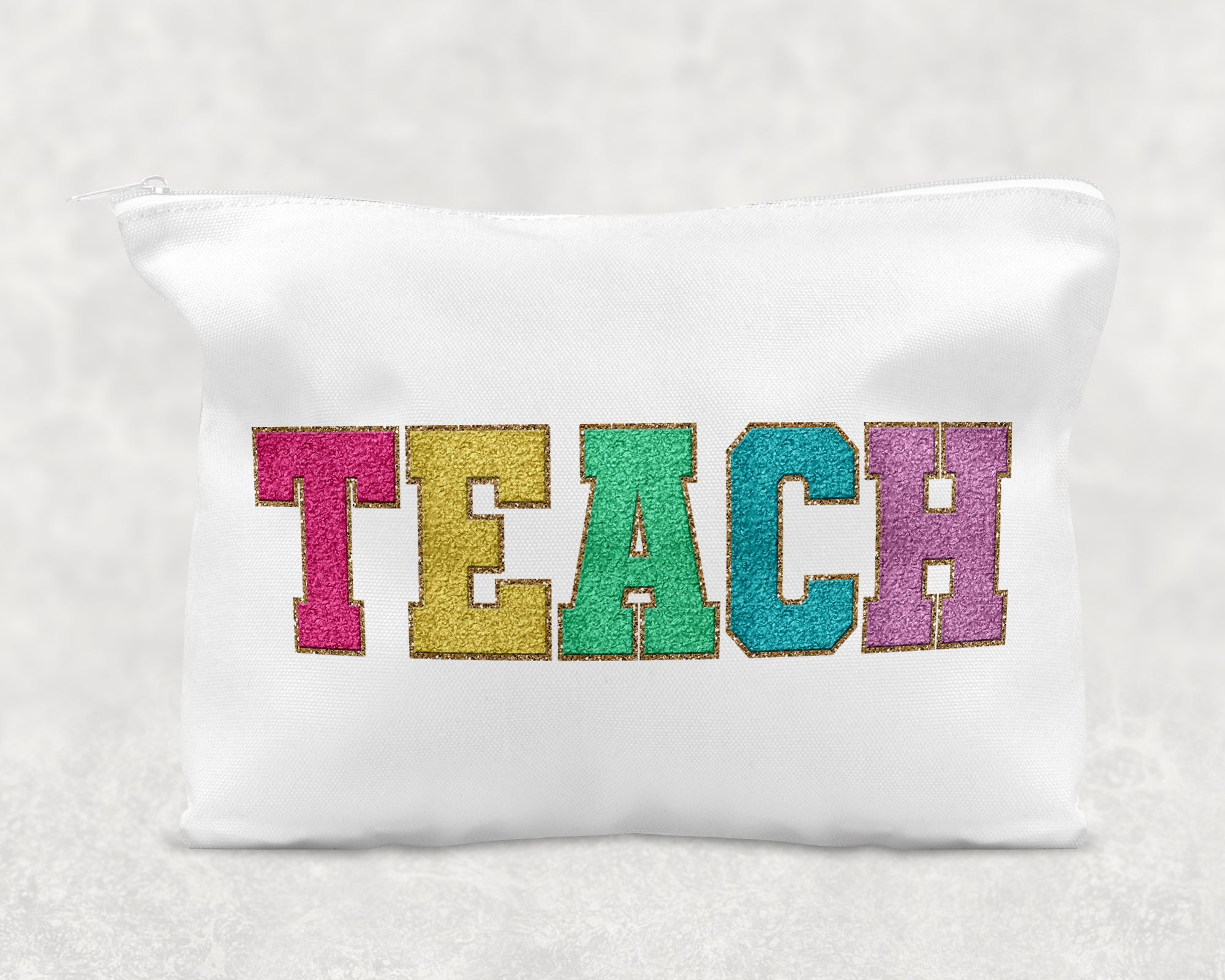 The CUTEST Personalized cosmetic bag for Teacher Appreciation with Sublimated TEACH in Faux Chenille Varsity Patch Letters!