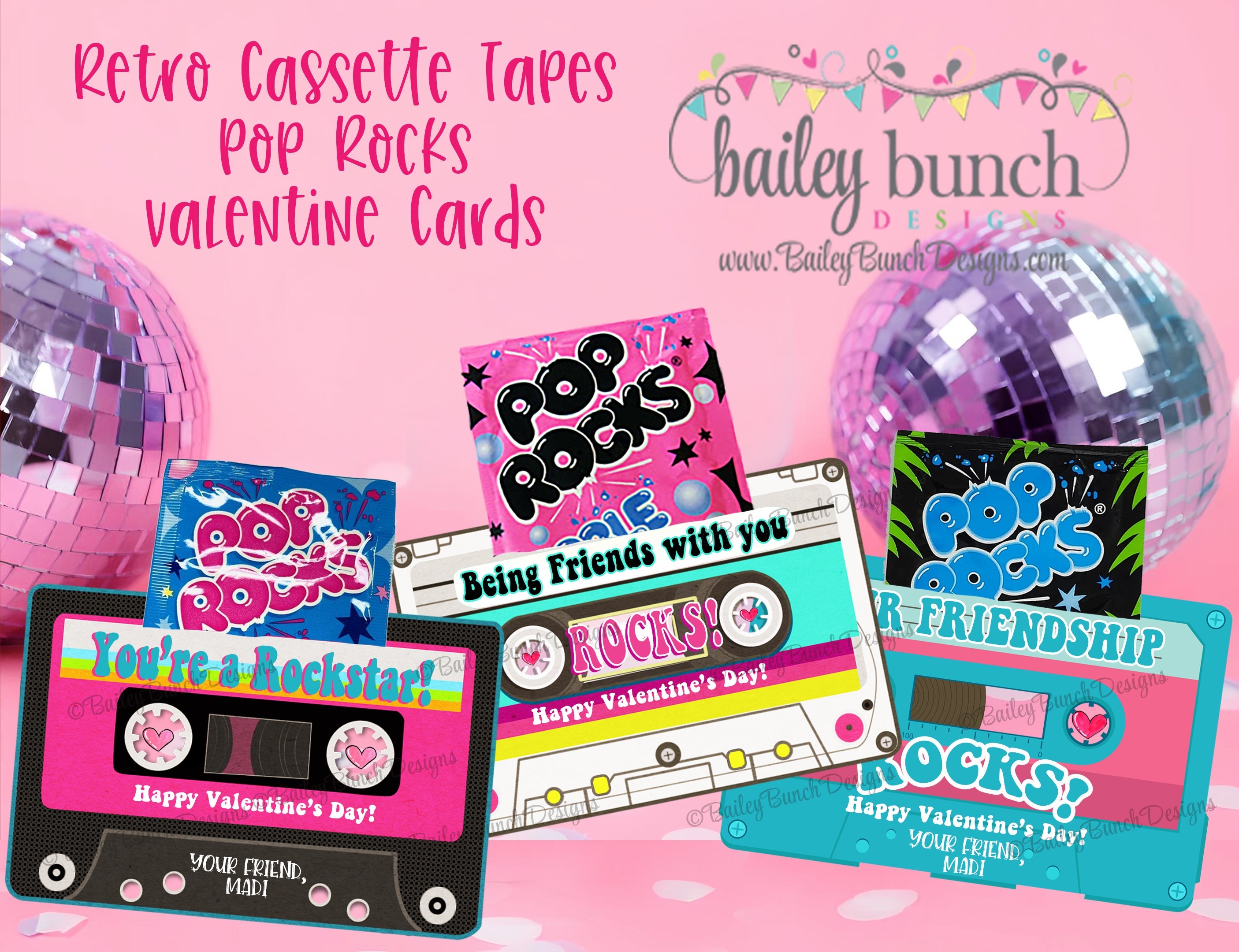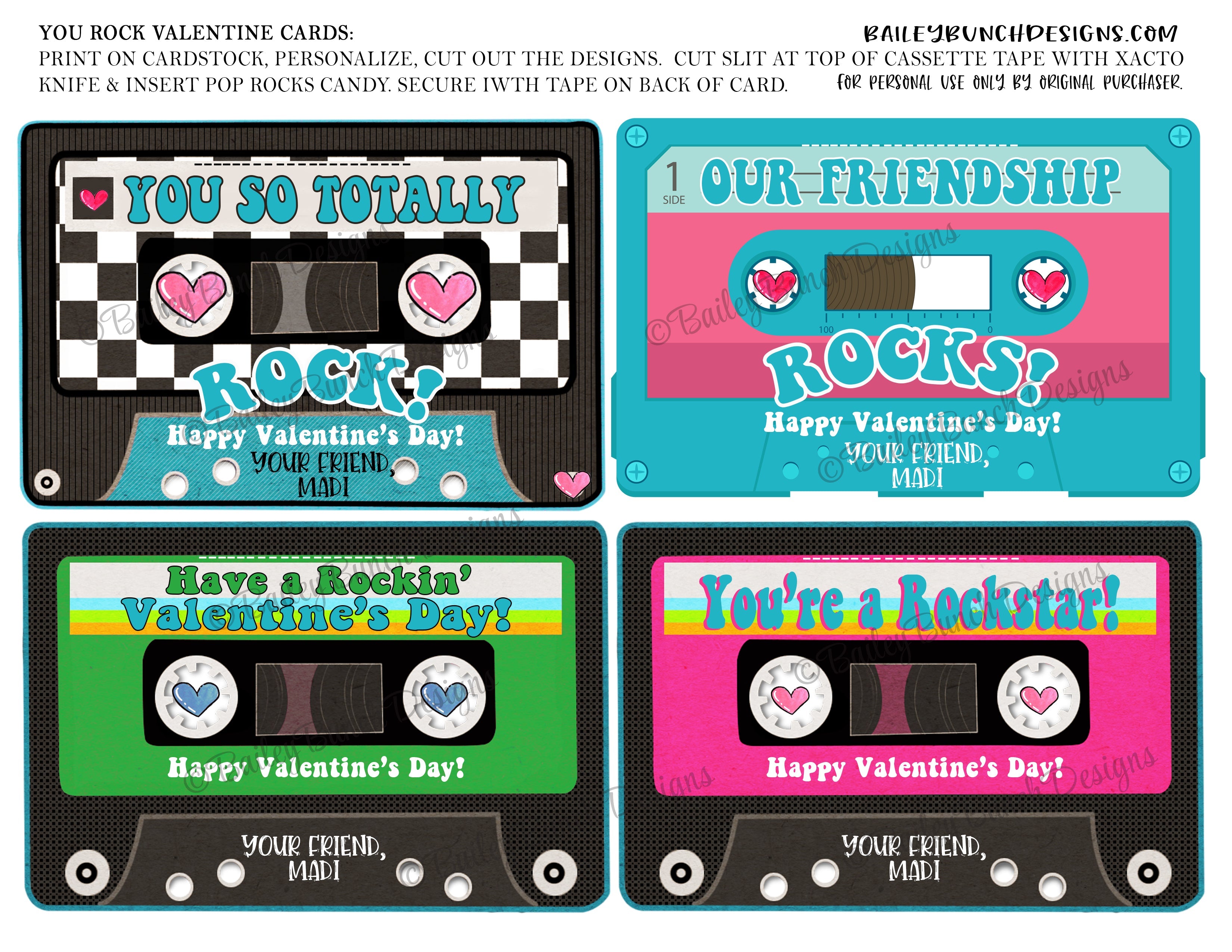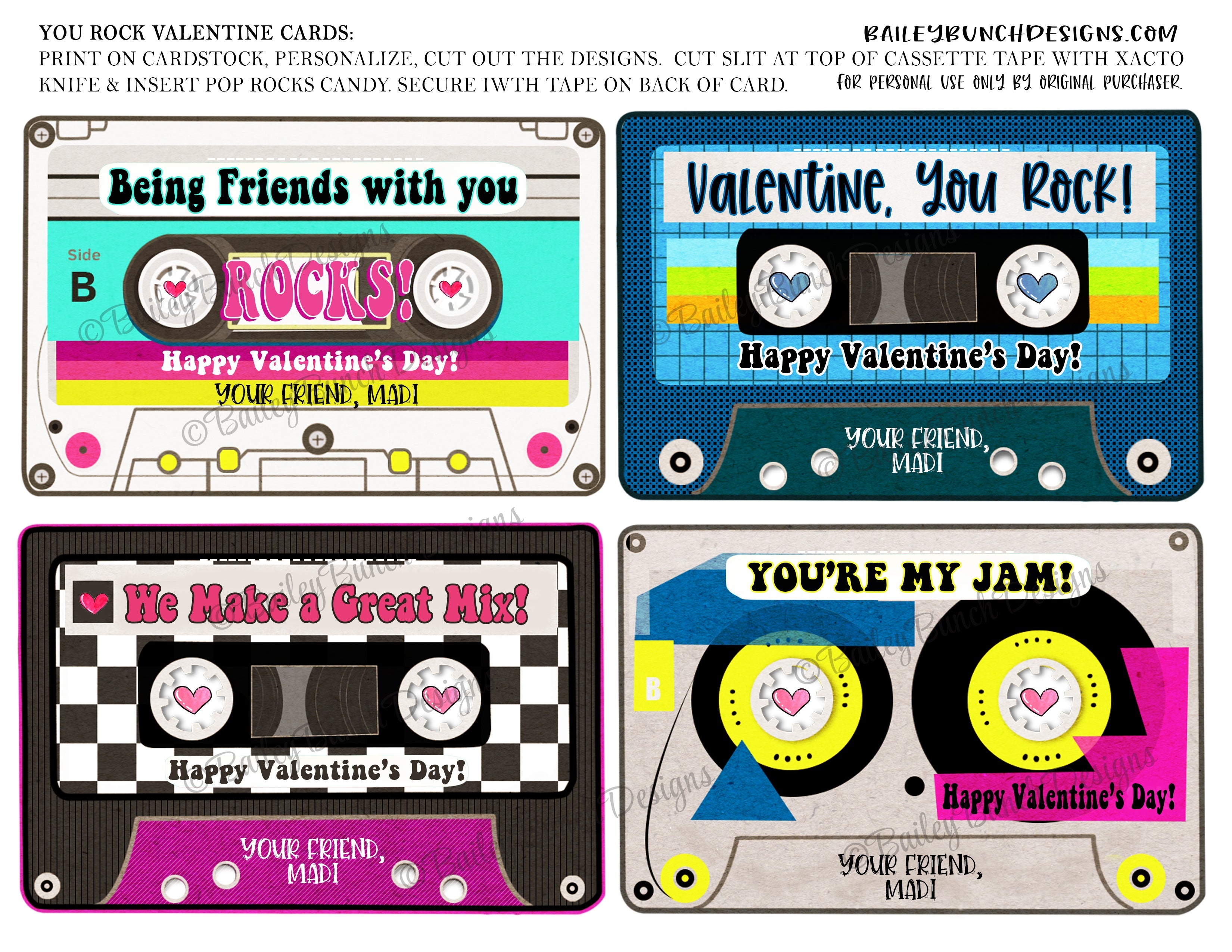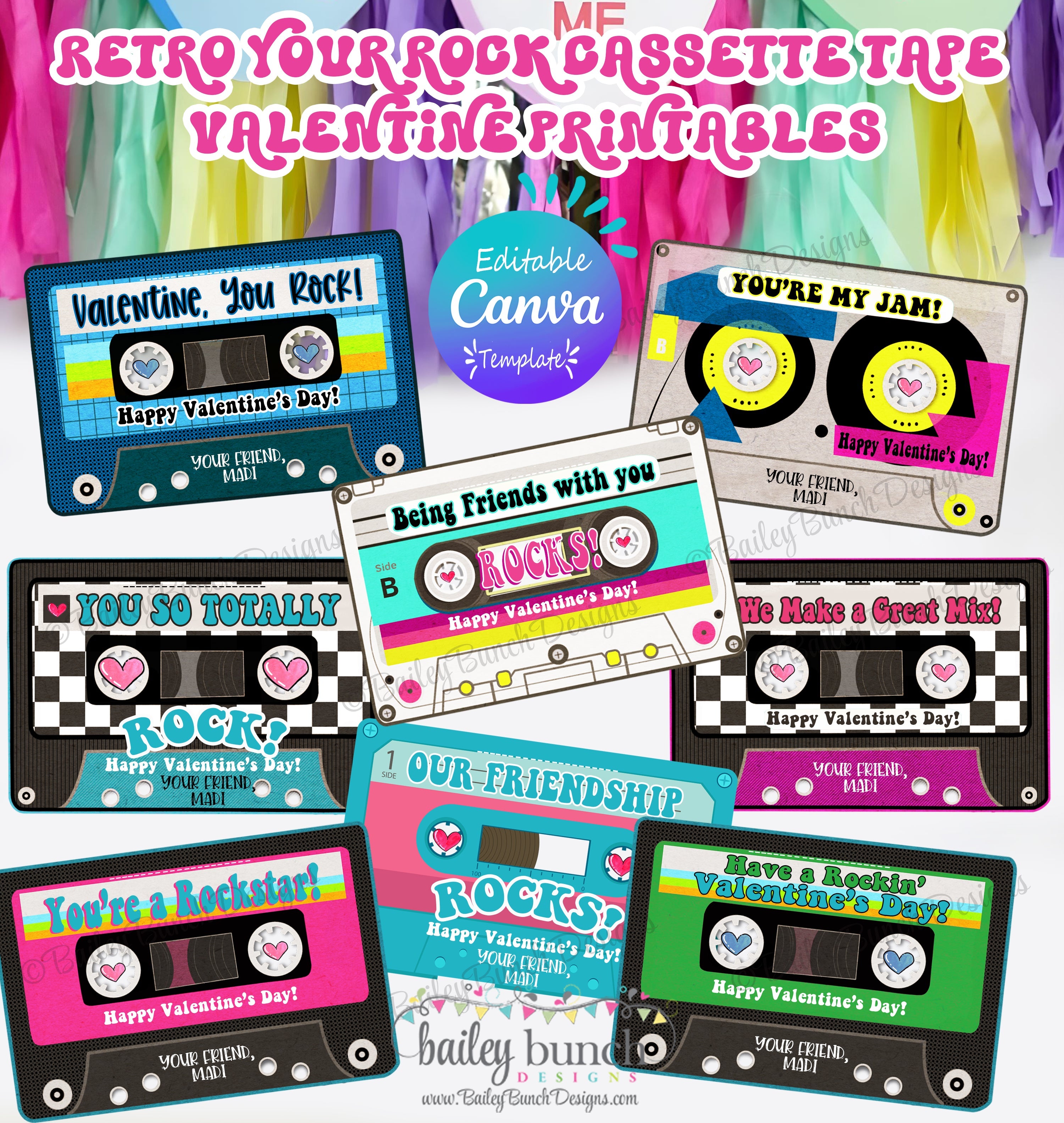 Celebrate Valentine’s Day with this adorable You Rock Retro Cassette Tape canva template Valentine's Day Cards! Pair these retro cassette valentines with pop rocks for a rockin' valentine treat kids will love. Cards print 4 per standard sheet. 8 Different designs and 8 different sayings. Print them all or choose your favorite! Print as many as you need. Nothing physical will be shipped.