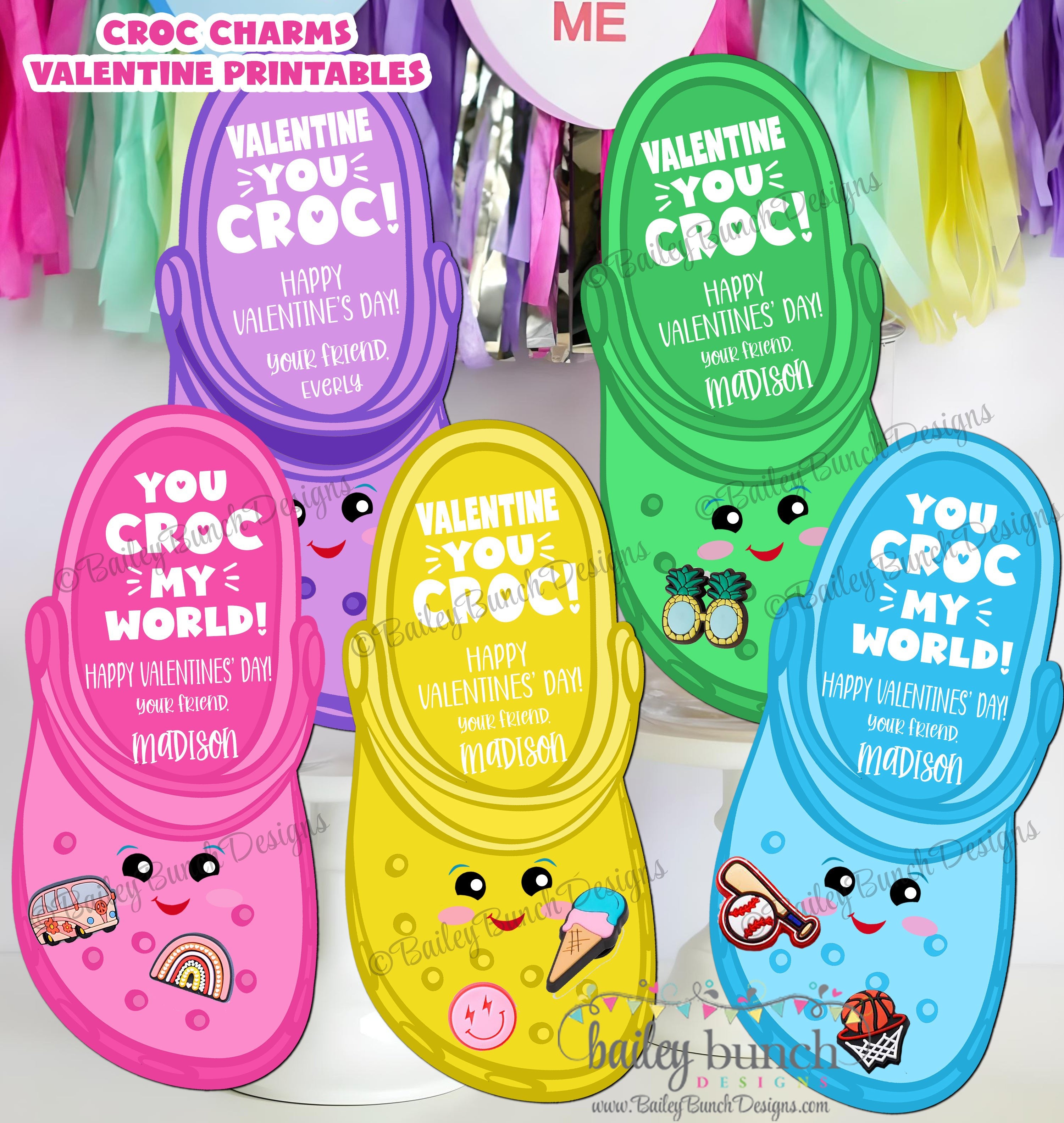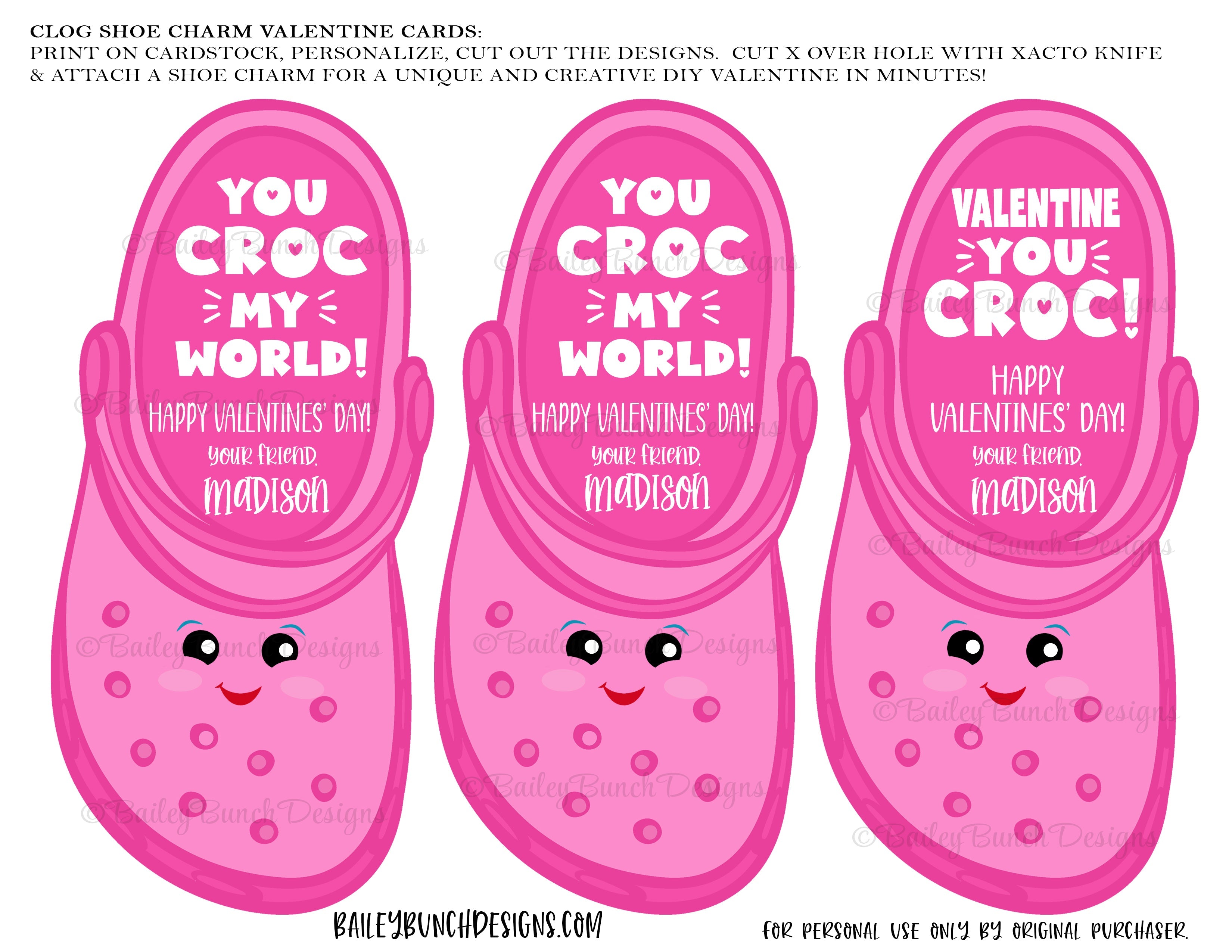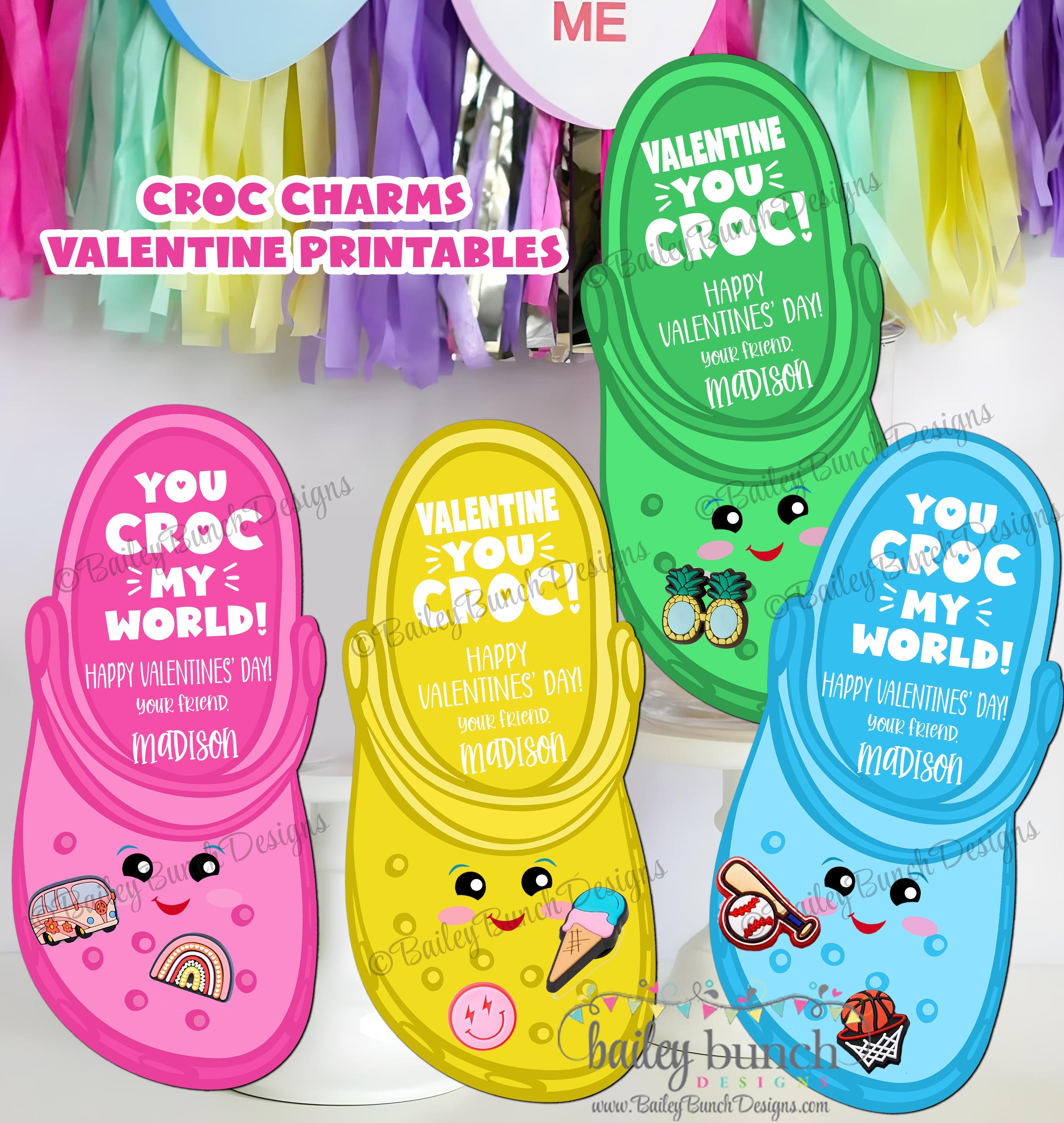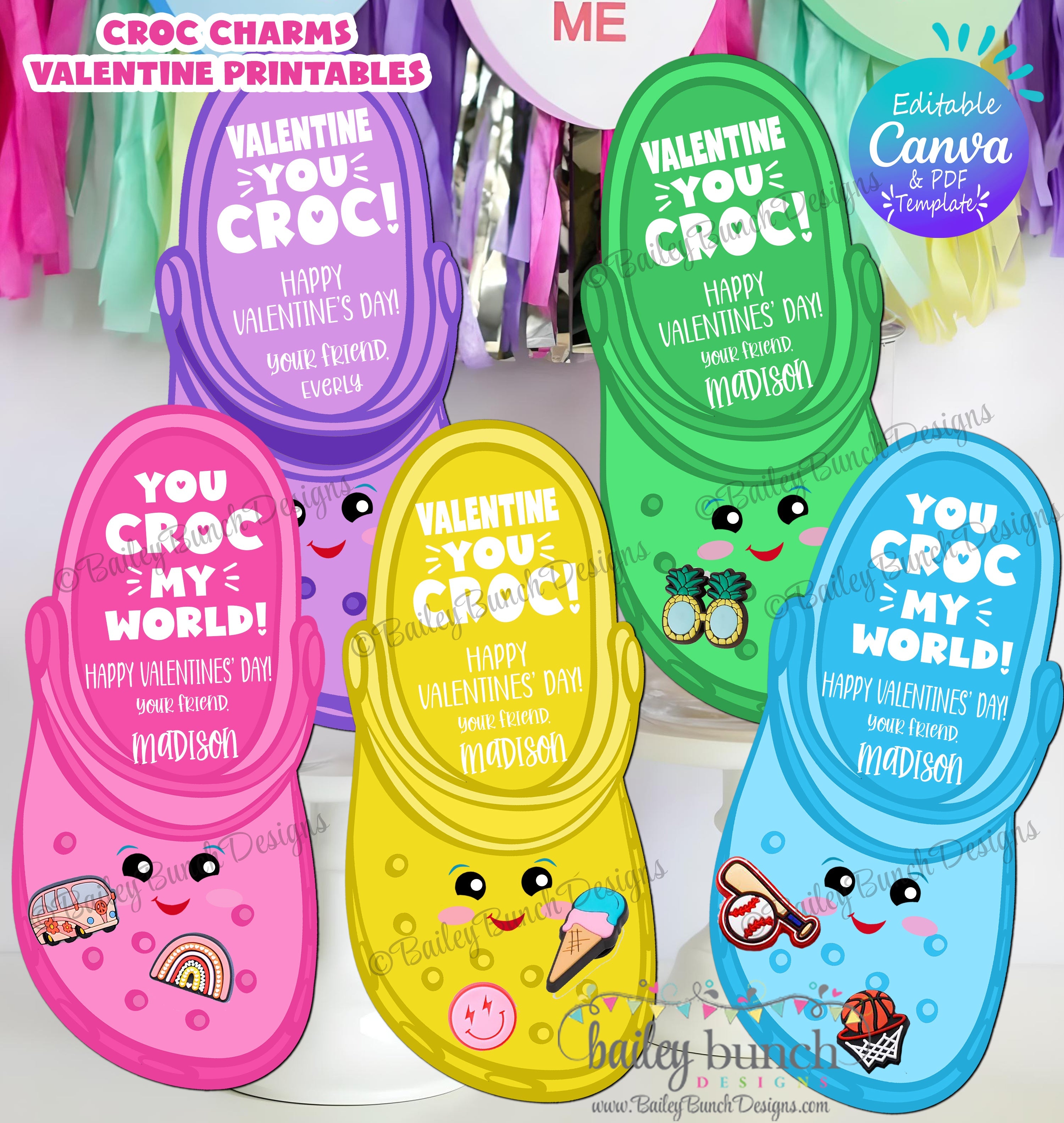You Croc My World! Looking for a super cute and easy kid's valentine? Look no further! This EDITABLE PDF & CANVA TEMPLATE Printable Shoe Charm Kids Valentine is too fun to pass up! This kids valentine printable comes in 4 different color options and 2 different wording options.