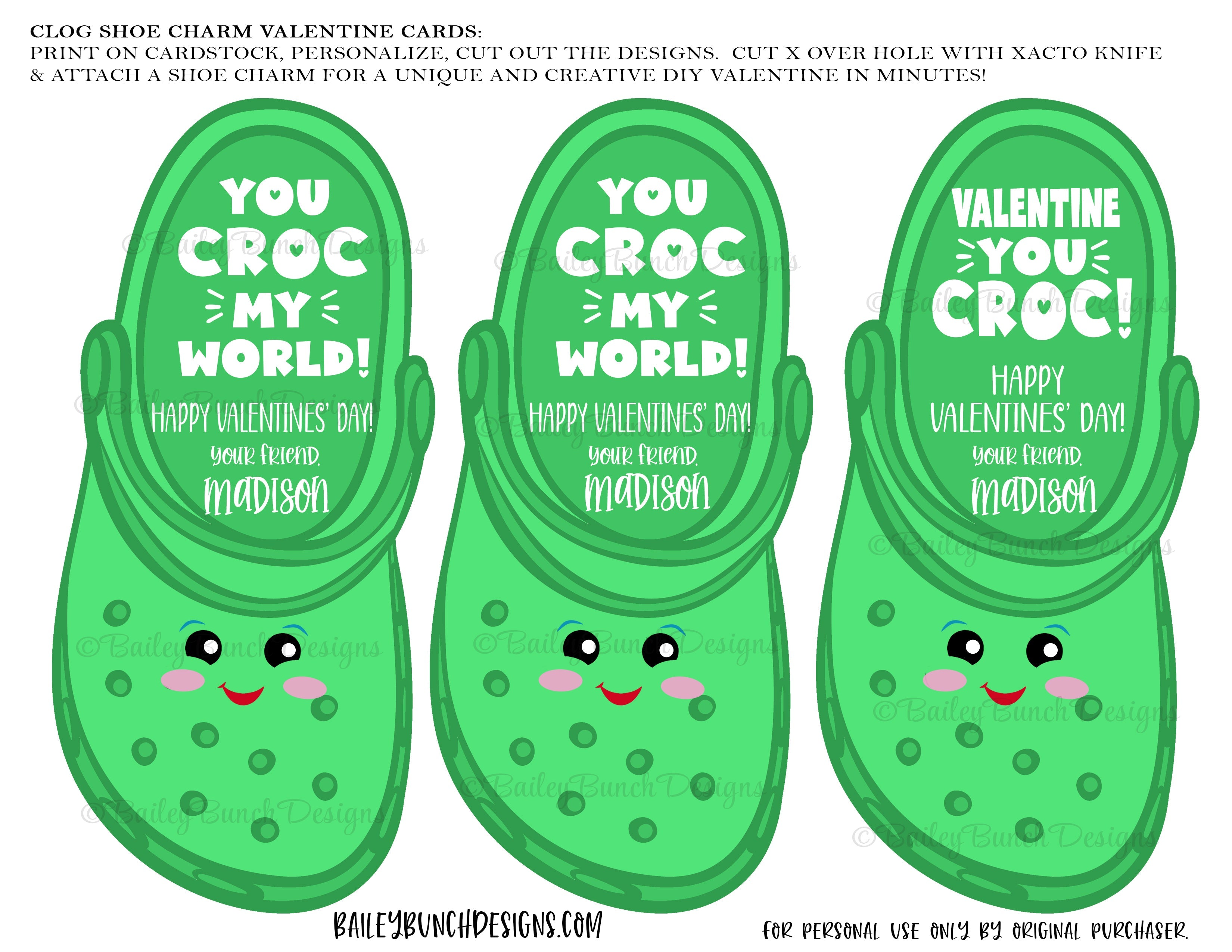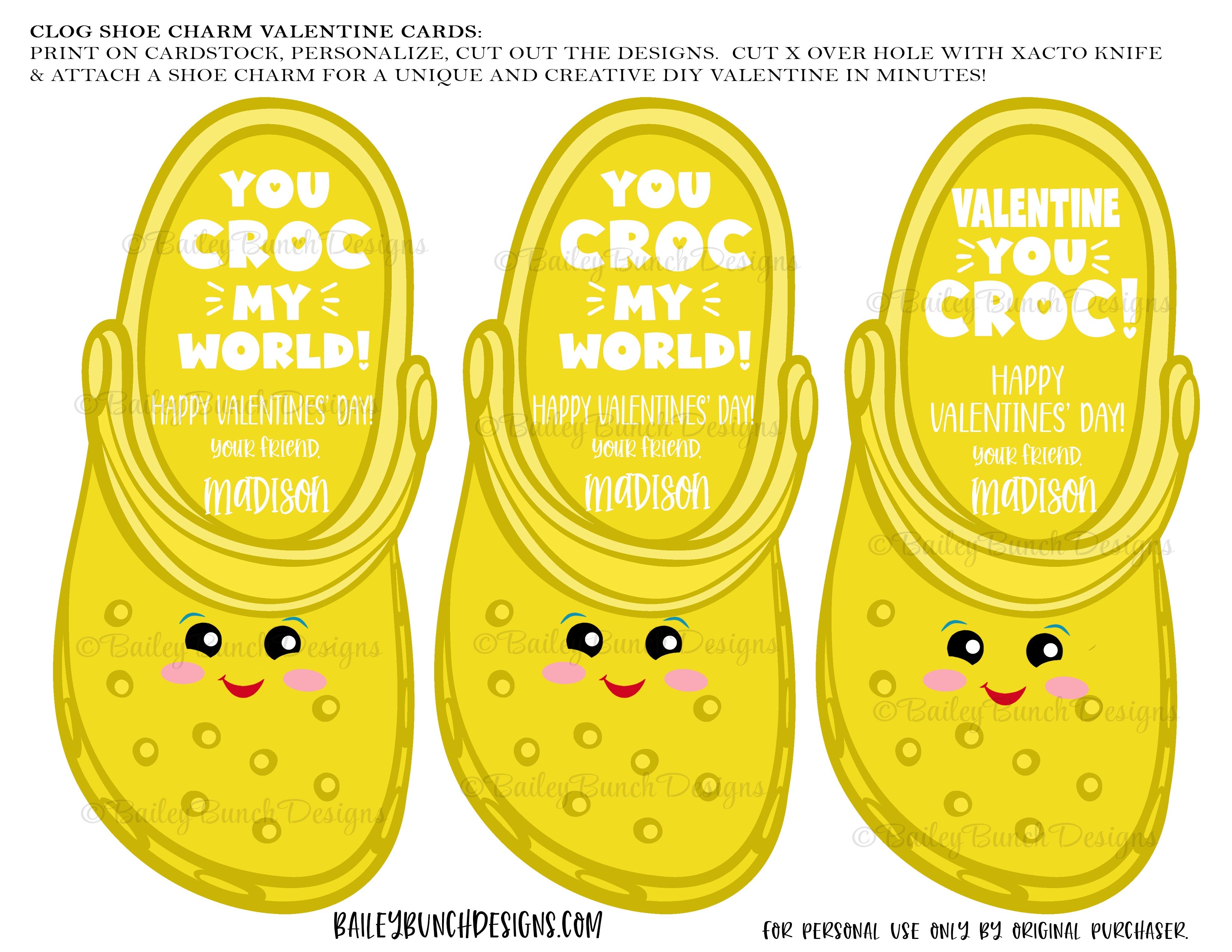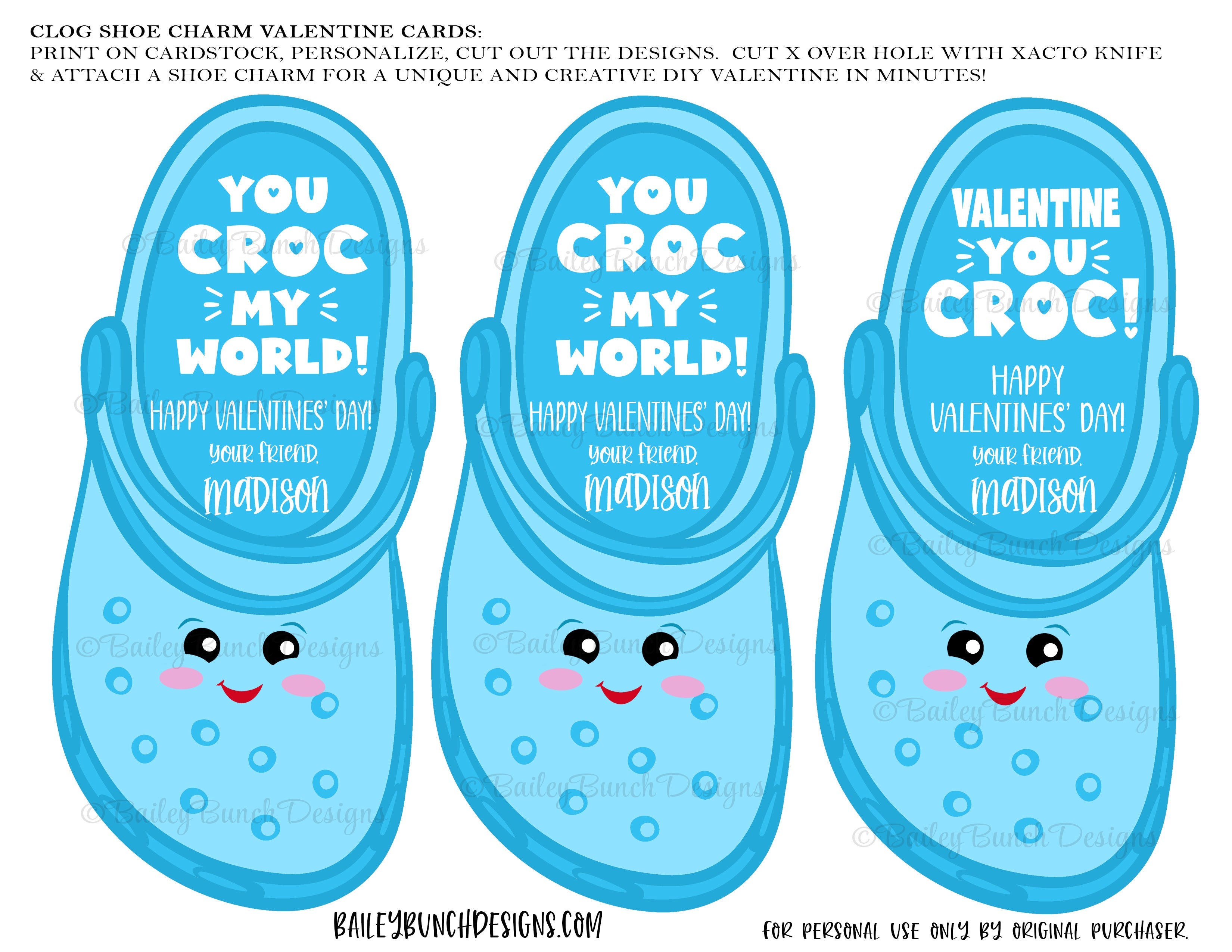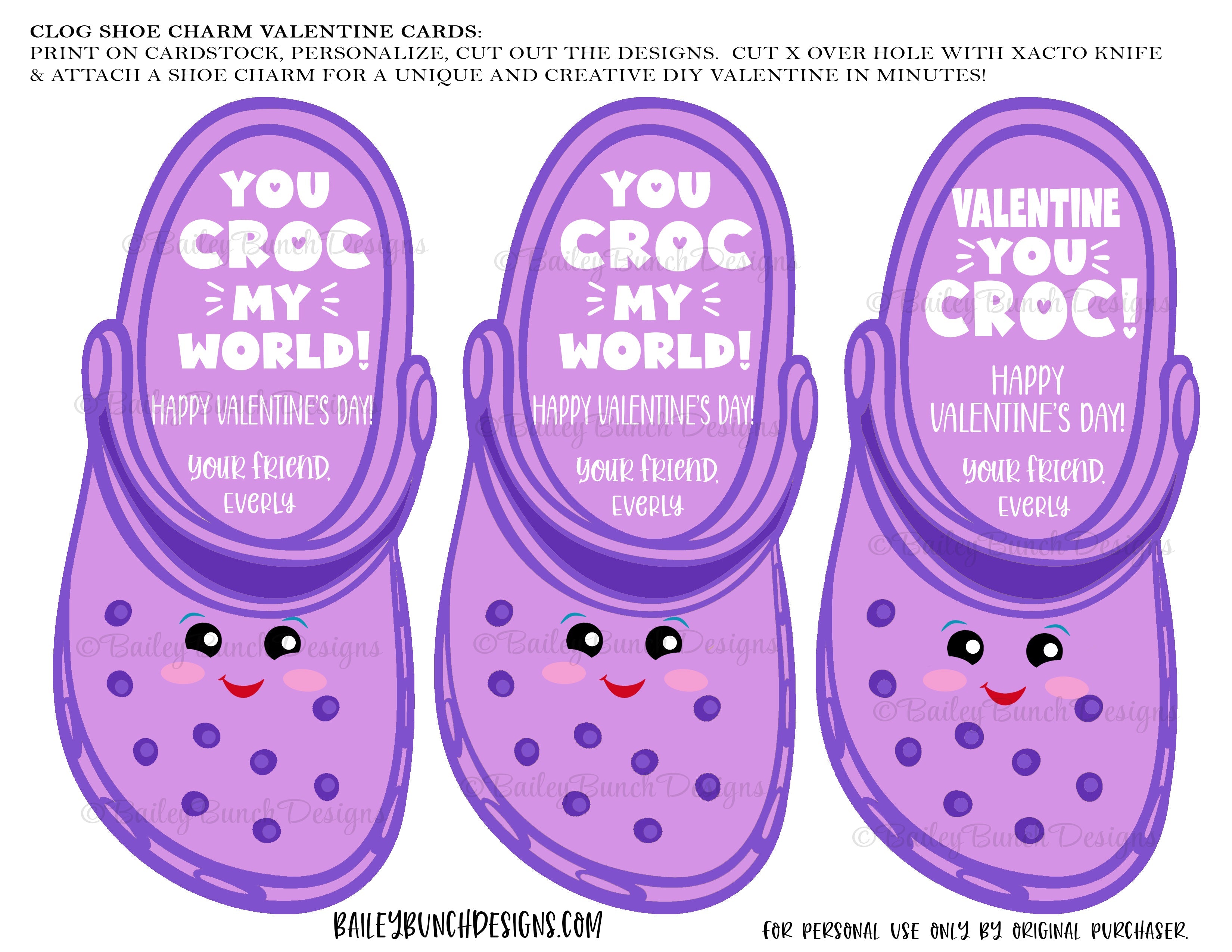 You Croc My World! Looking for a super cute and easy kid's valentine? Look no further! This EDITABLE PDF & CANVA TEMPLATE Printable Shoe Charm Kids Valentine is too fun to pass up! This kids valentine printable comes in 4 different color options and 2 different wording options.