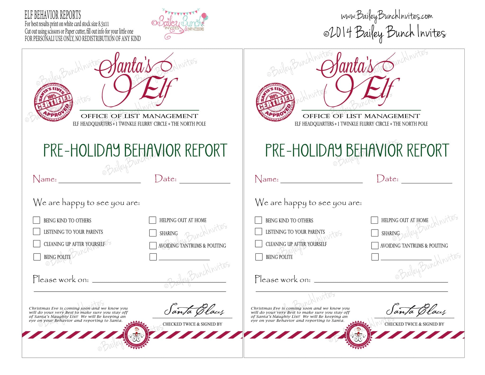 Elf Printables, Christmas Elf, nice list, naughty list, behavior report, Santa IDELF0520