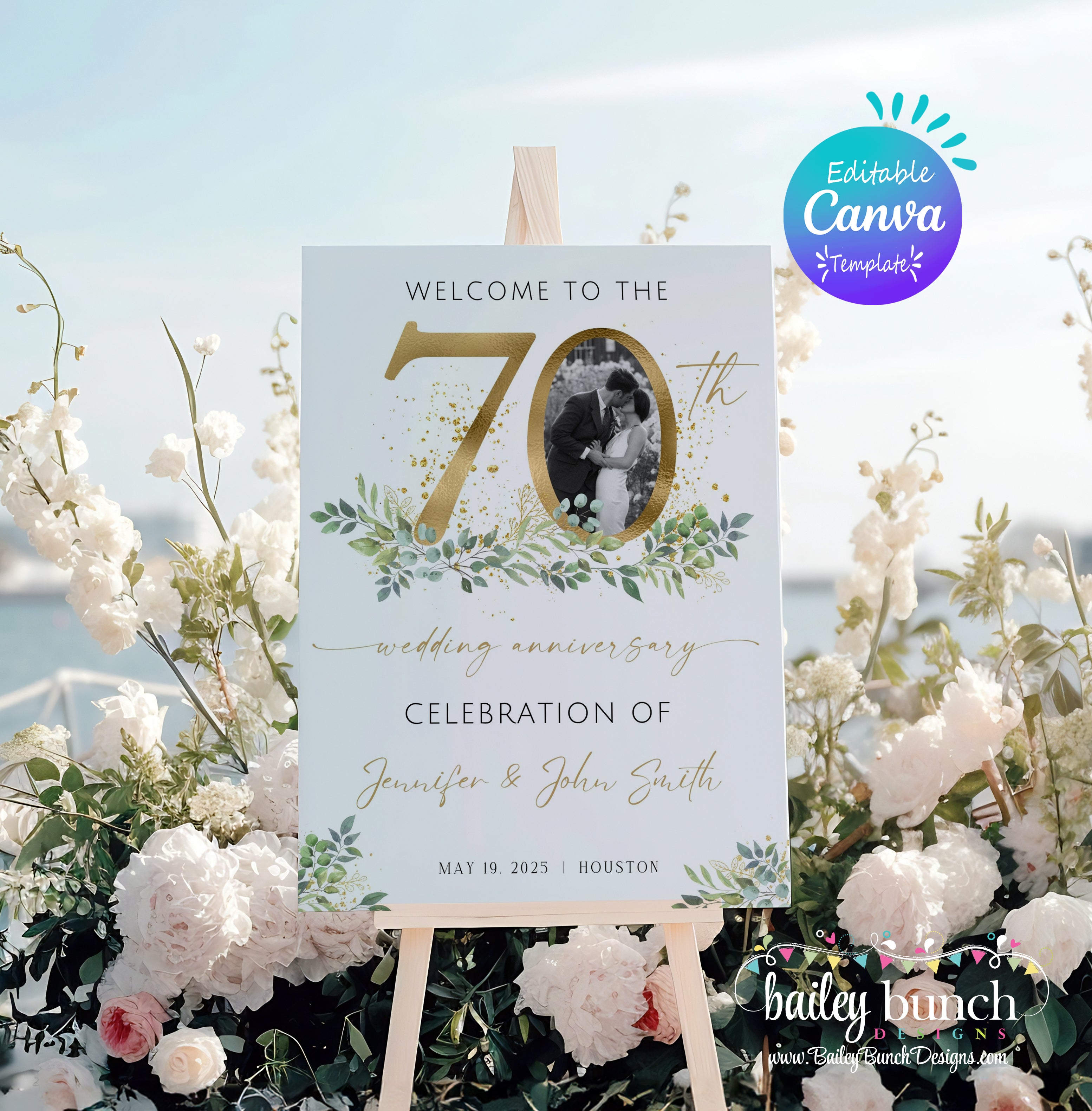 Welcome your guests in style to your 70th wedding anniversary celebration with our simple modern and minimalist Welcome Sign Templates. Super quick and easy to edit, allowing you to plan the perfect fiftieth anniversary celebration. The template is fully editable in Canva which allows you to personalize every detail, creating a customized invitation that reflects your unique taste.