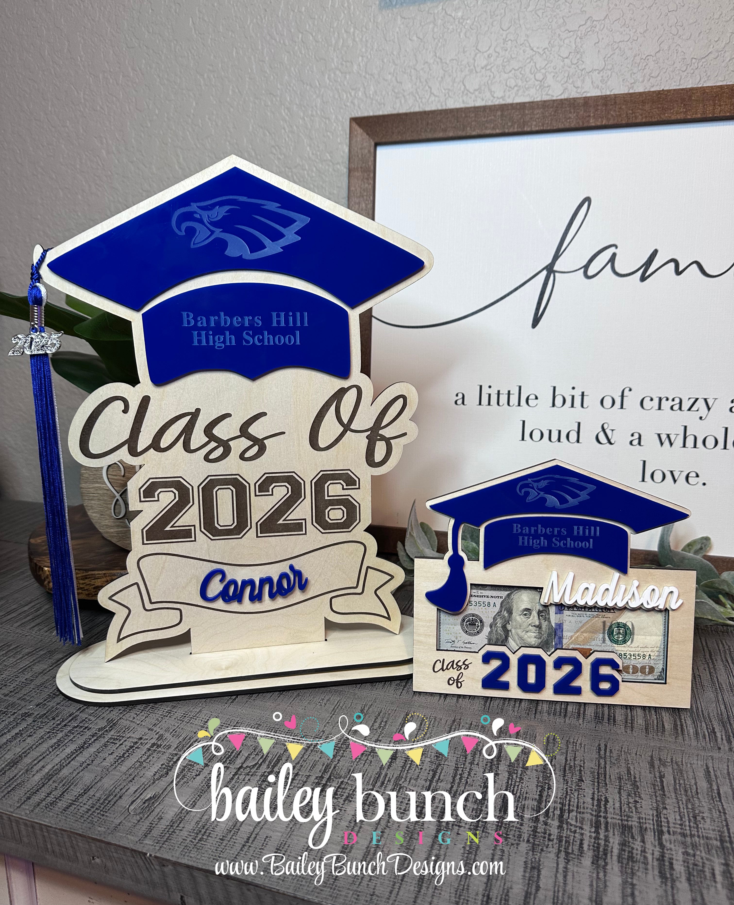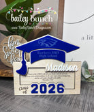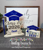 Celebrate their achievements with this beautifully handcrafted Wooden Money Holder, with Royal Blue accents. Perfect as a Graduation 2026 Gift for Her or Graduation Class of 2026 Gift for Him. Each piece is carefully laser-cut, making it a one-of-a-kind Personalized Graduation Money Holder that holds cash or gift cards in style.