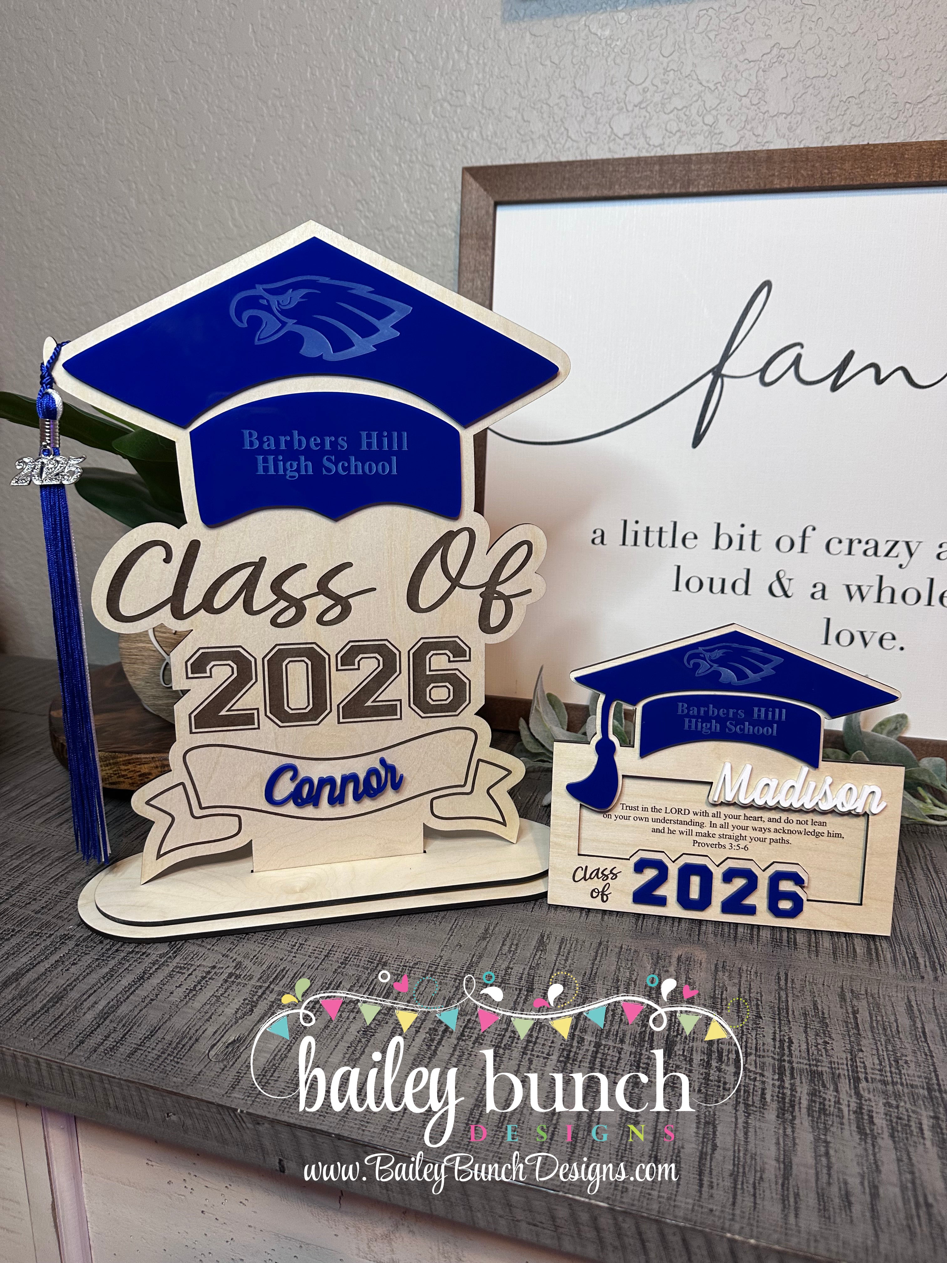 Made from quality wood & acrylic, precision laser-cut for a clean, polished look, this piece makes a thoughtful gift or keepsake for any graduate.  Engraved with school Mascot and School Name