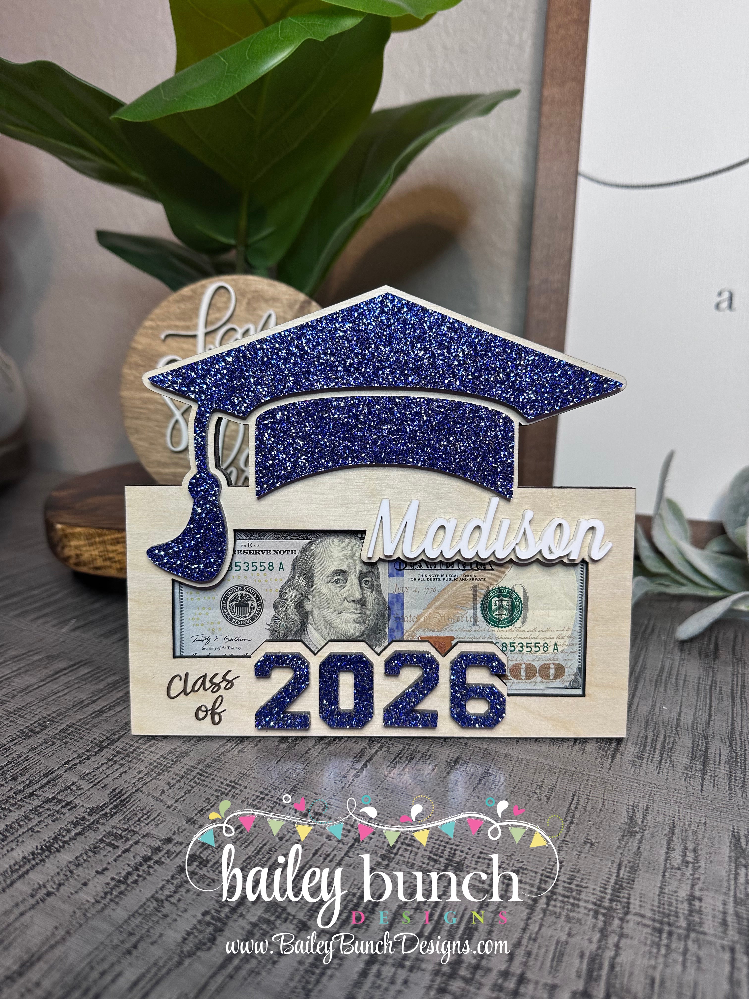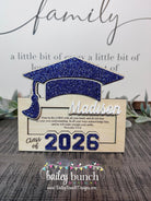 Celebrate their achievements with this beautifully handcrafted Wooden Money Holder, with Royal Blue accents. Perfect as a Graduation 2026 Gift for Her or Graduation Class of 2026 Gift for Him. Each piece is carefully laser-cut, making it a one-of-a-kind Personalized Graduation Money Holder that holds cash or gift cards in style.