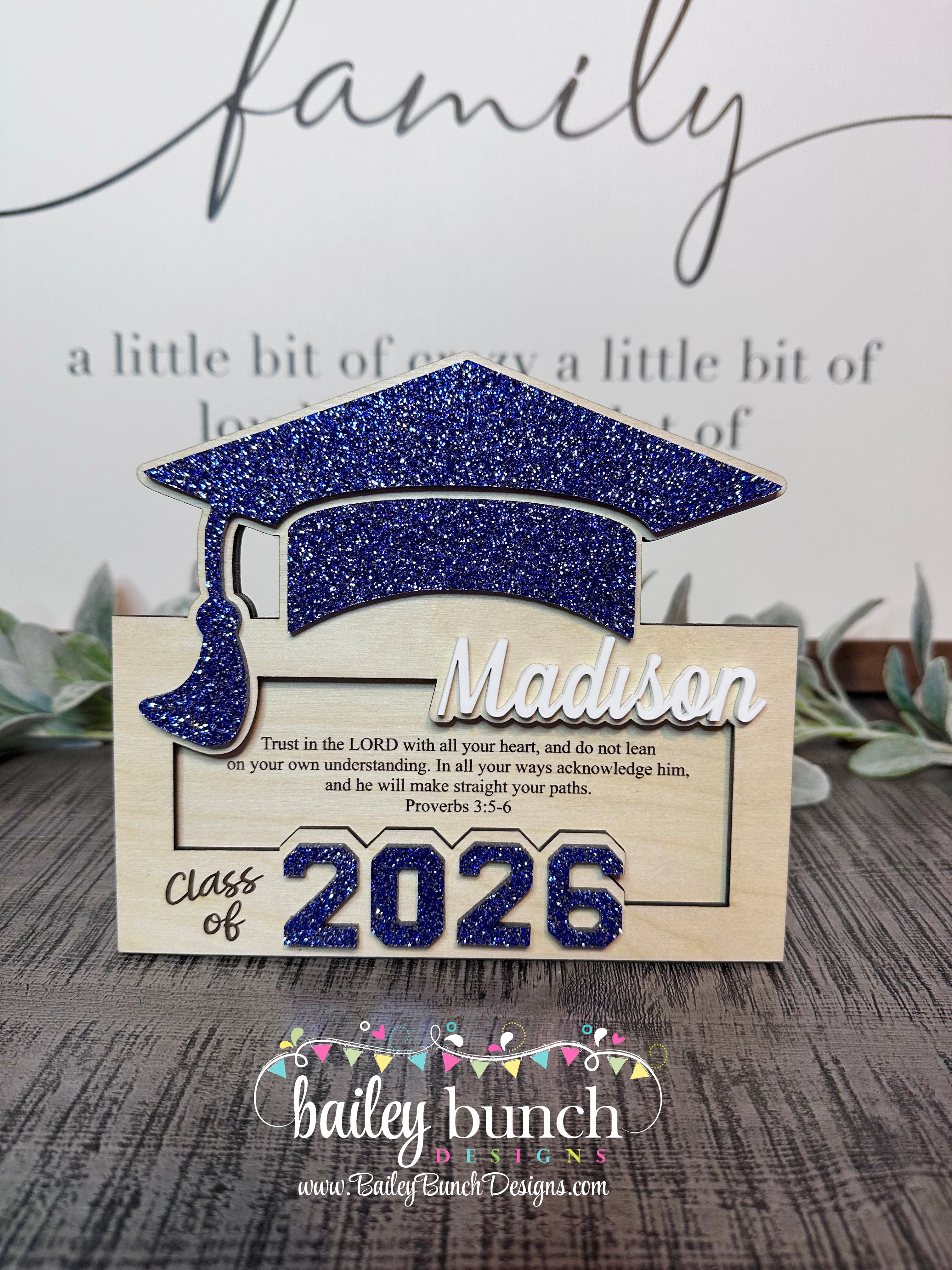 Made from quality wood & BLUE GLITTER acrylic, precision laser-cut for a clean, polished look, this piece makes a thoughtful gift or keepsake for any graduate.Â