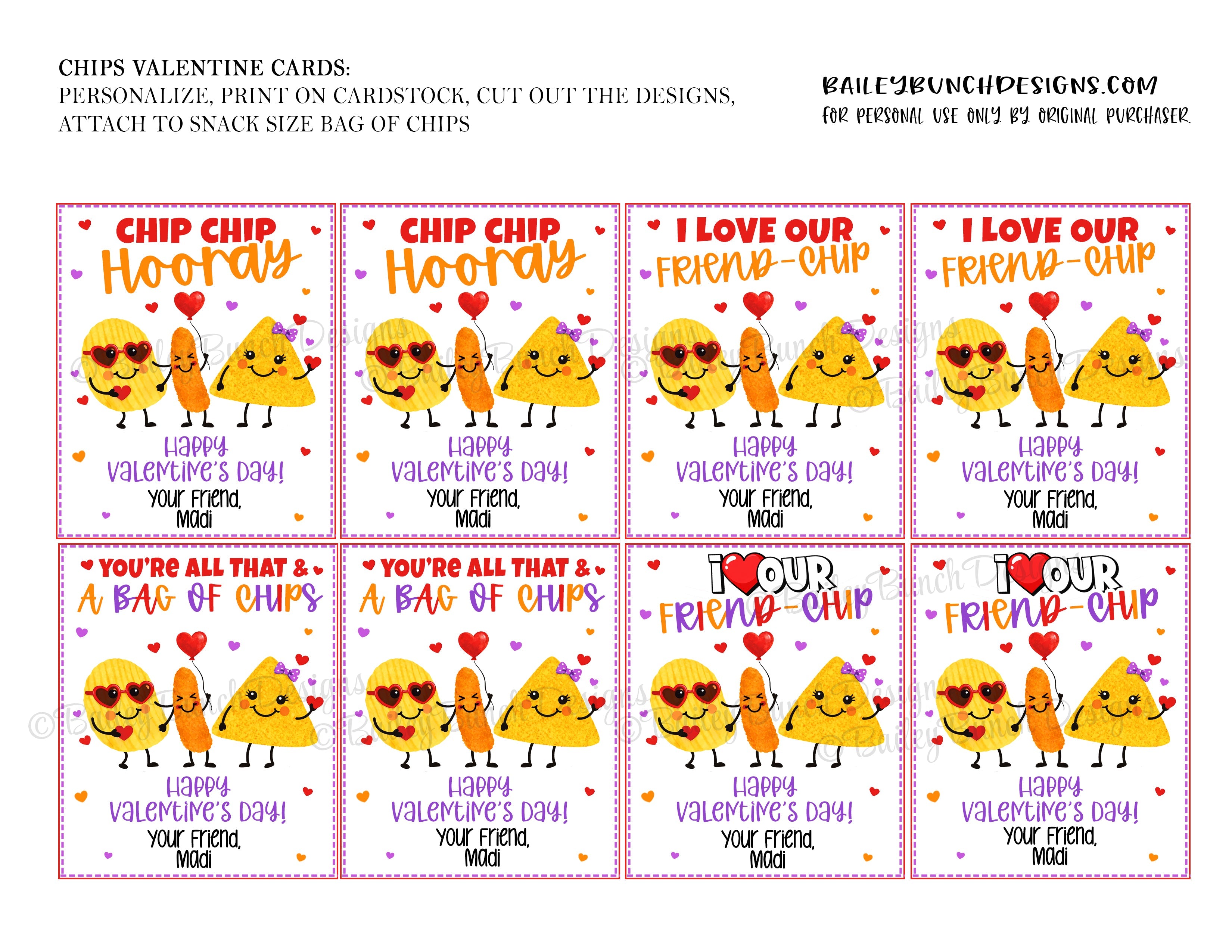 Looking for a super cute and easy kid's valentine? Look no further! This EDITABLE CANVA TEMPLATE Printable adorable Chips Kids Valentine are too fun to pass up! This kids valentine printable comes in 4 different designs and wording.