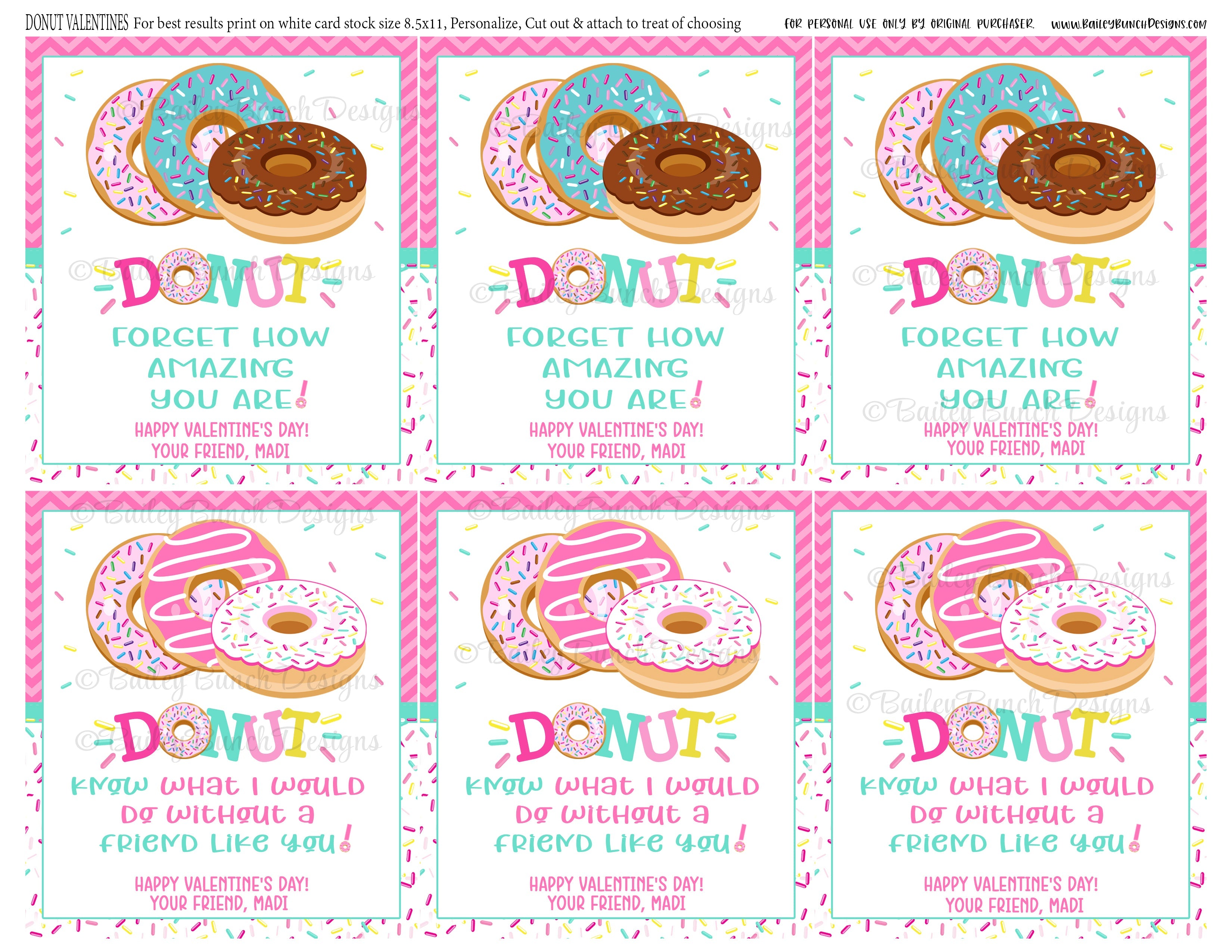 SIX Donut designs are sized to fit on the 8.5x11 inch page. The Canva Template has editable fields for the text personalization area(s) (name). The graphics and design wording are NOT editable.