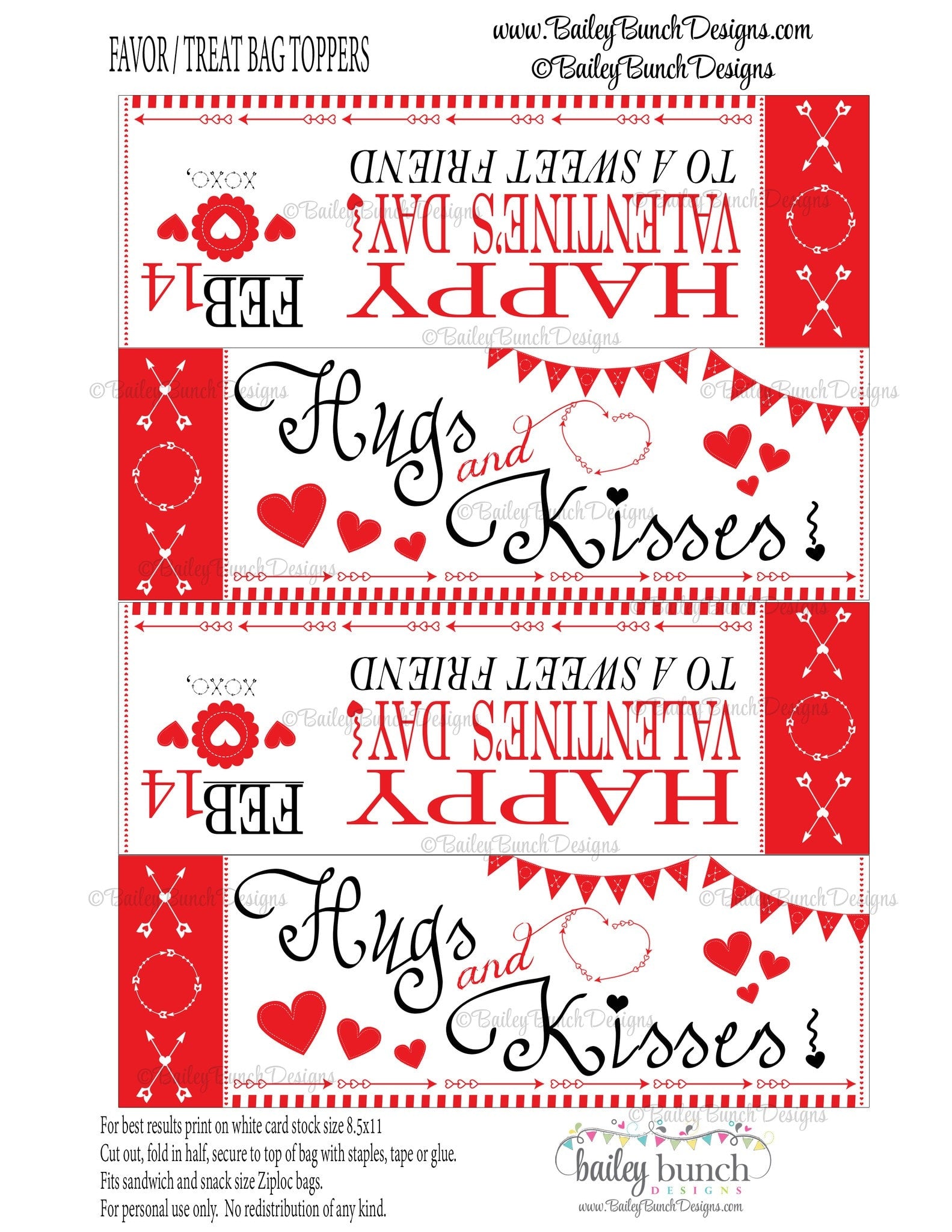 Hugs & Kisses Bag Toppers, Valentines - 2 DESIGNS!! INSTANT DOWNLOAD